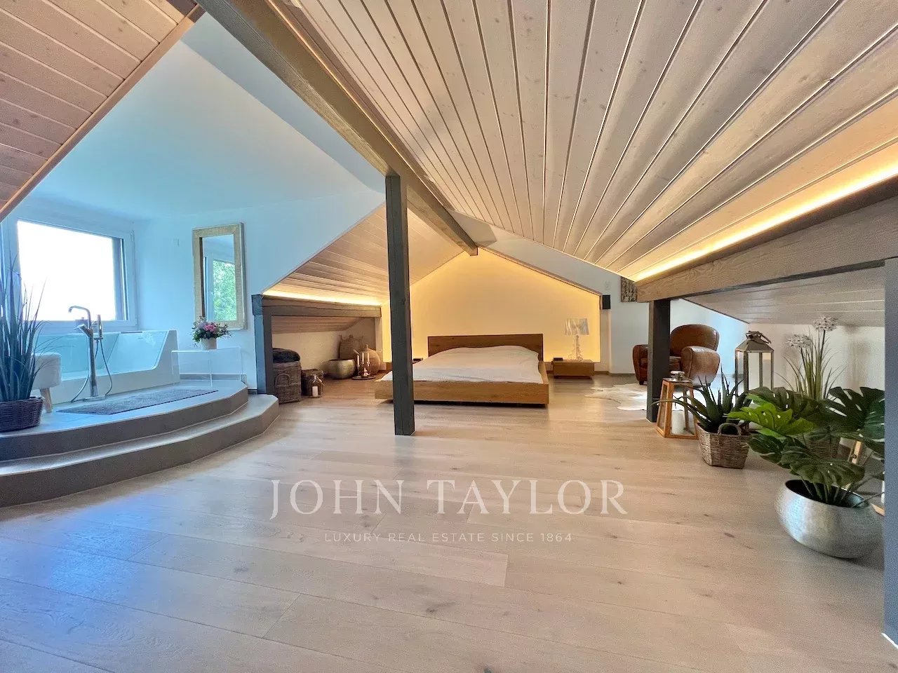 Upstairs, the master suite under the roof offers a reading area, a shower room, and a bathtub positioned to enjoy the lake view.