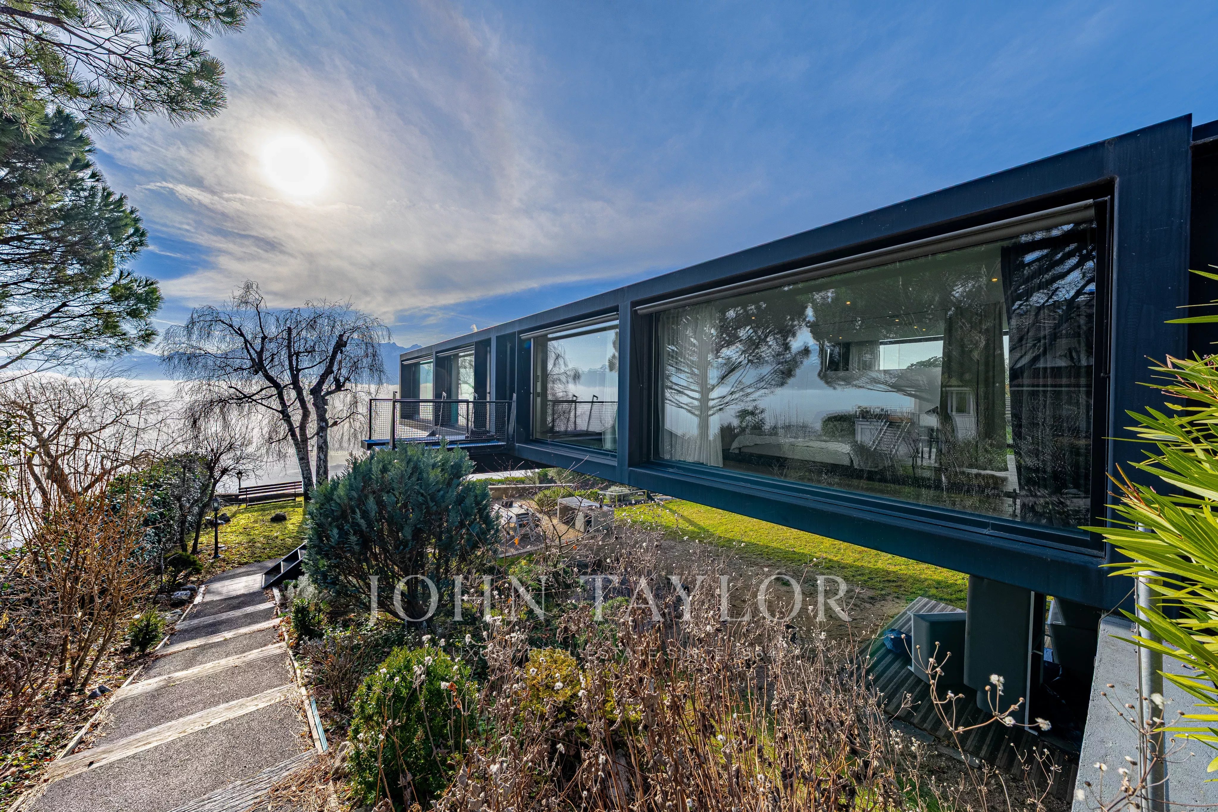 This architect-designed villa, with its resolutely contemporary style, offers a rare living environment combining minimalist lines, large glass volumes and spectacular views of the lake and mountains.
