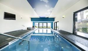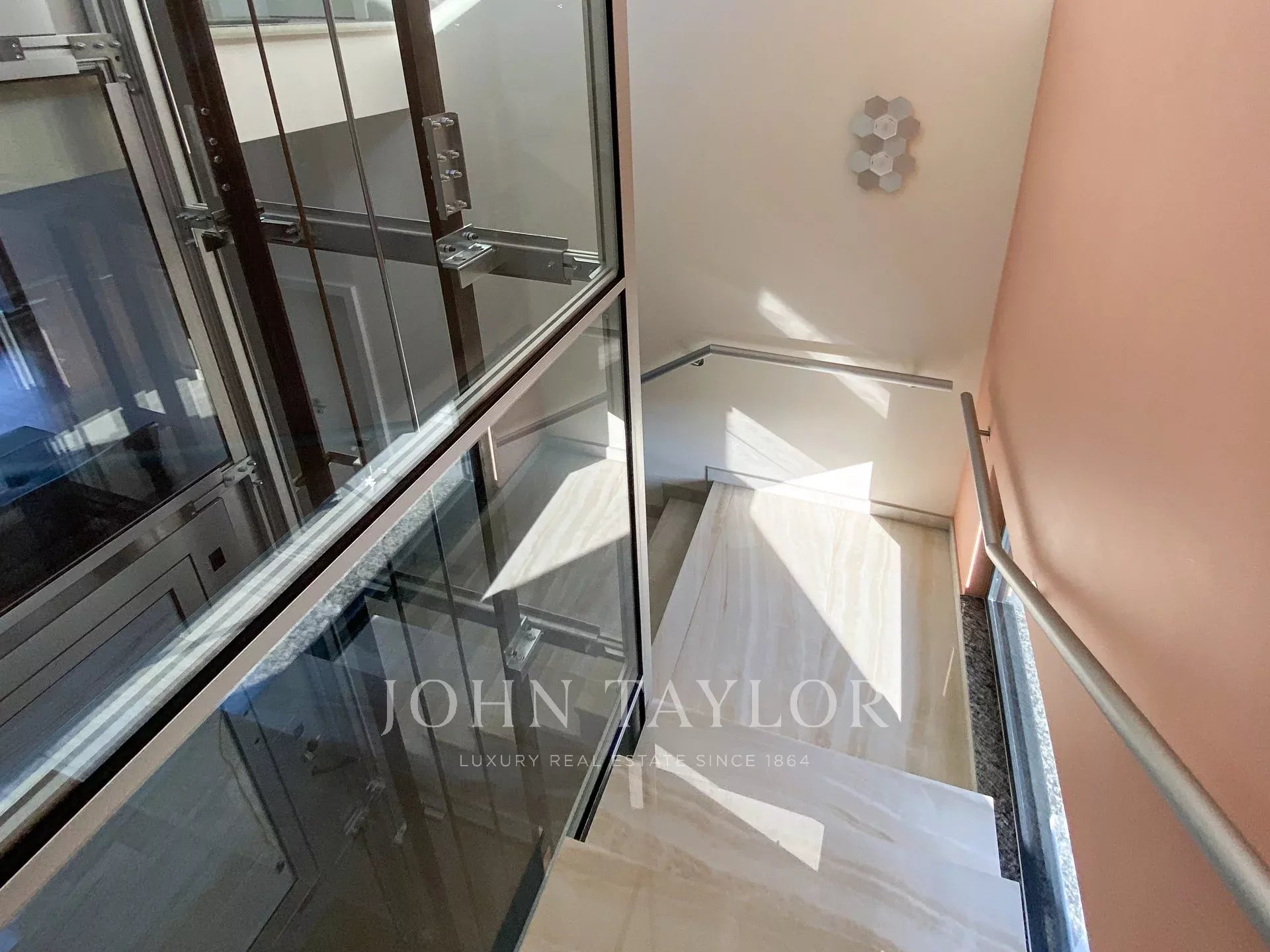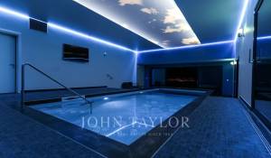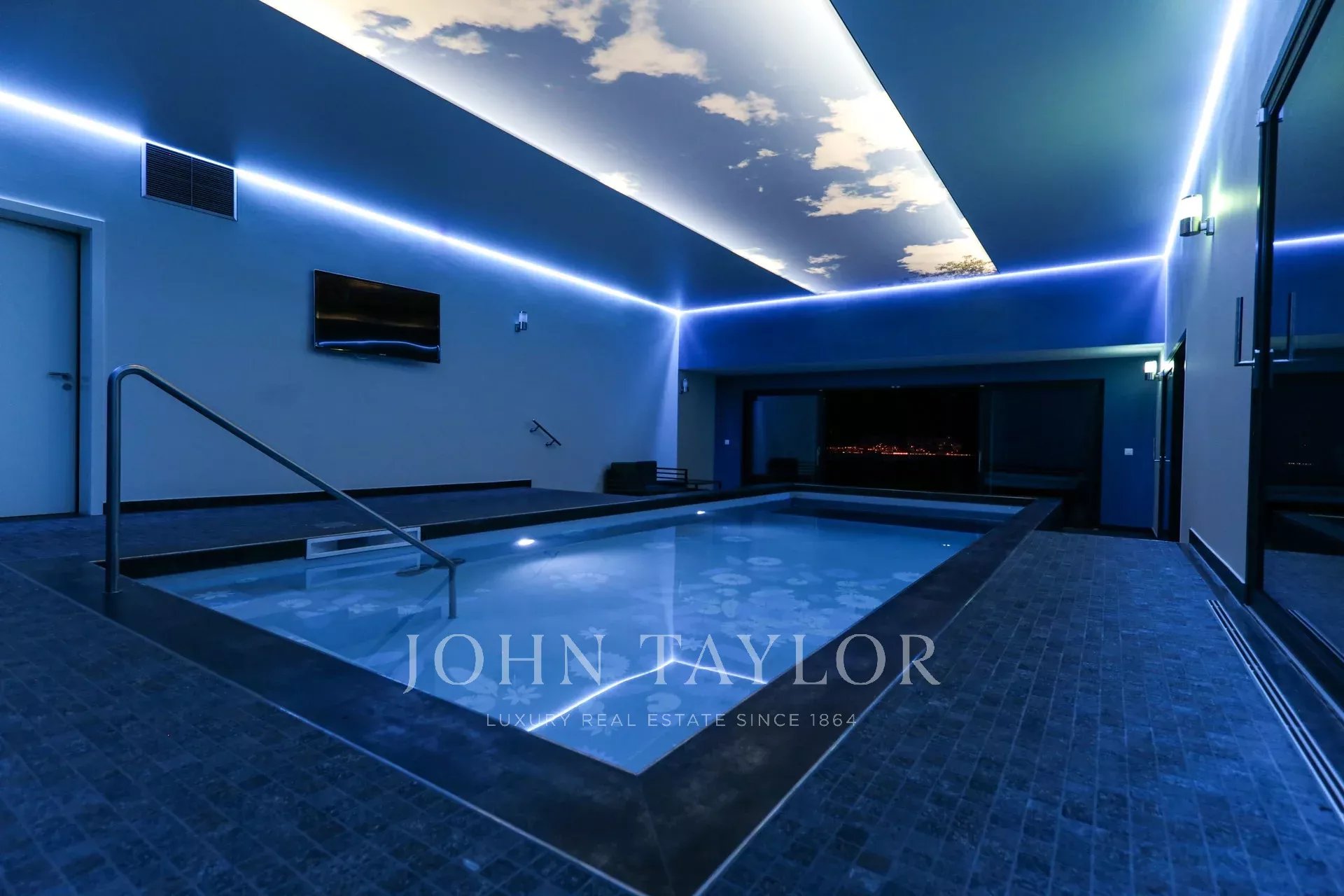 Modern comforts include an elevator, a gym with sauna, and a jacuzzi integrated into the large indoor pool for unparalleled relaxation. The outdoor relaxation pool on the 1st floor, lined with landscape lights, becomes the center of attraction during the summer months. Electric blinds and a sophisticated alarm system add to the convenience and security of this residence.
