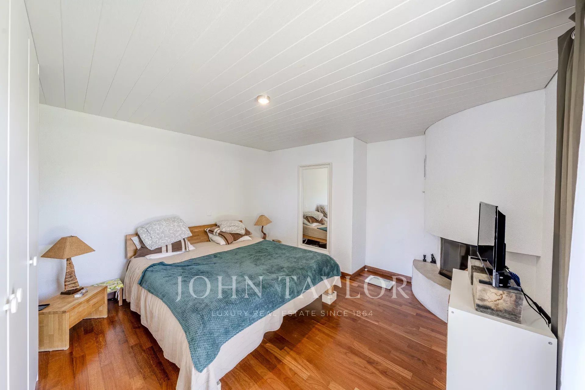 Spacious master bedroom with fireplace