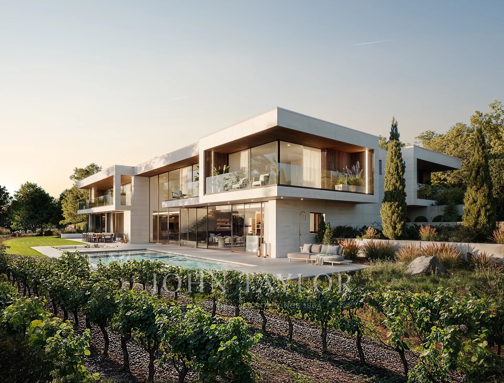 -Contemporary architecture with clean lines and noble materials