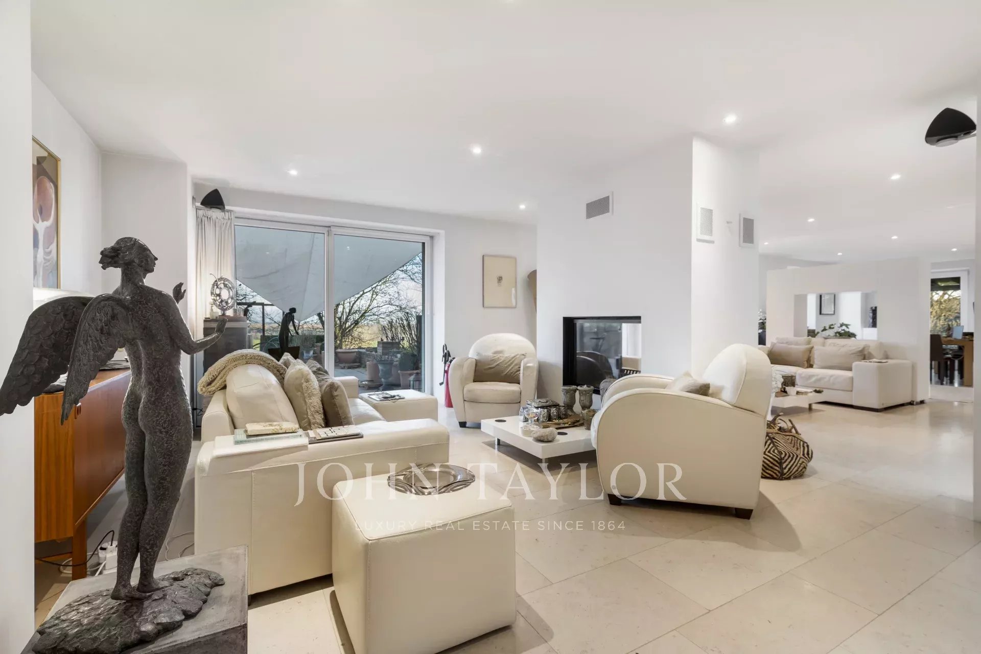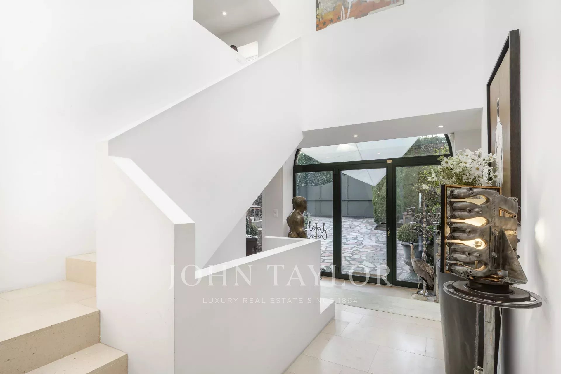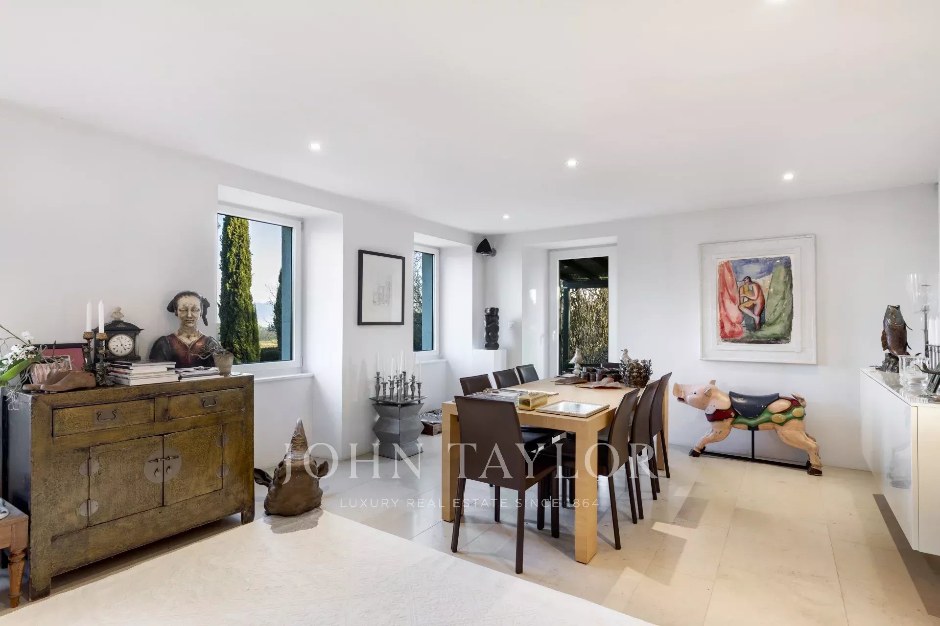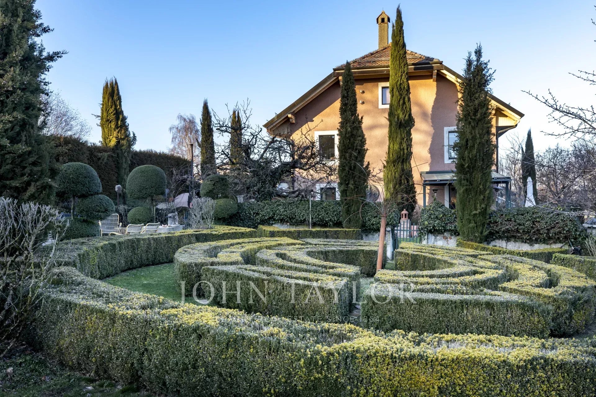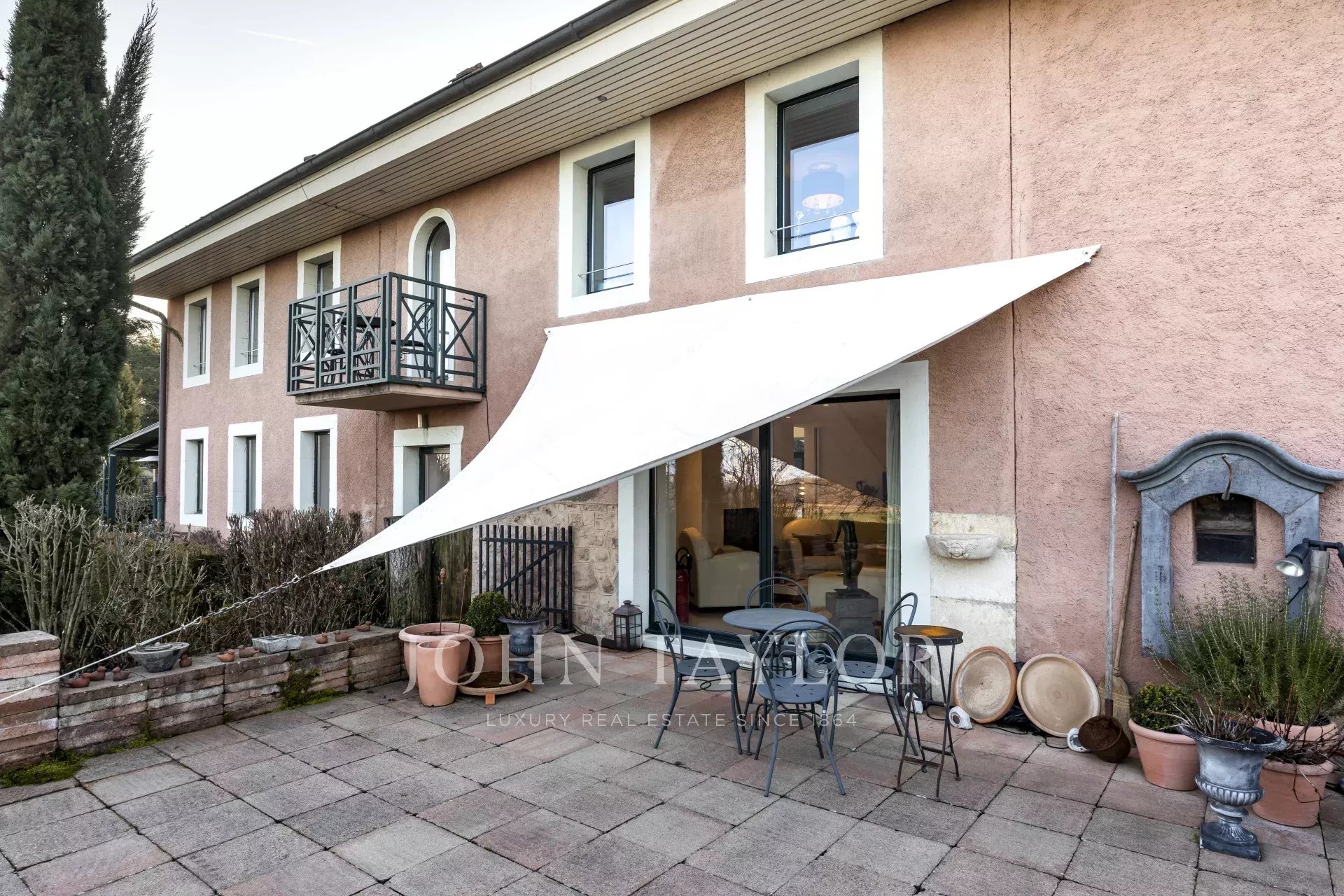The property sits on a 1720 m², south-facing plot, adorned with peaceful gardens, charming terraces, as well as fountains and ponds, creating an oasis of tranquility. An external parking area provides space for three vehicles.