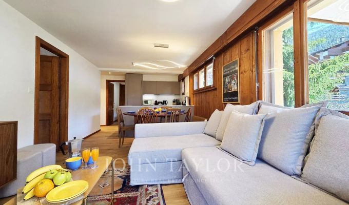 Modern ground floor apartment in central Gstaad. Spacious living room with modern fire ...