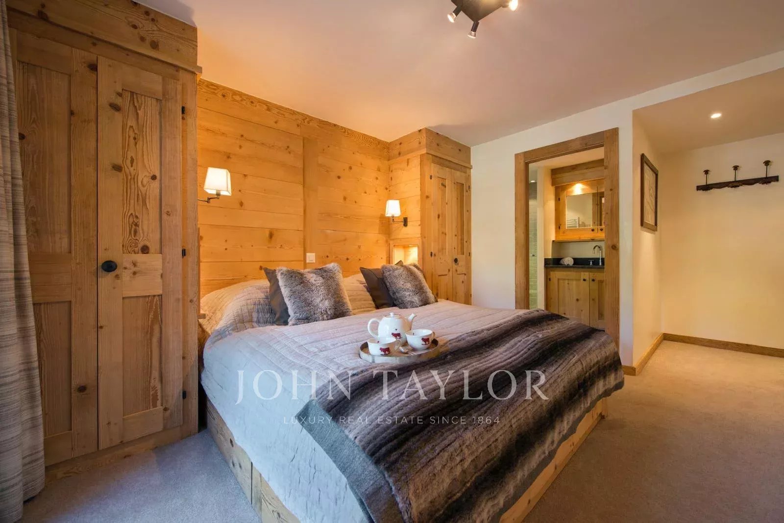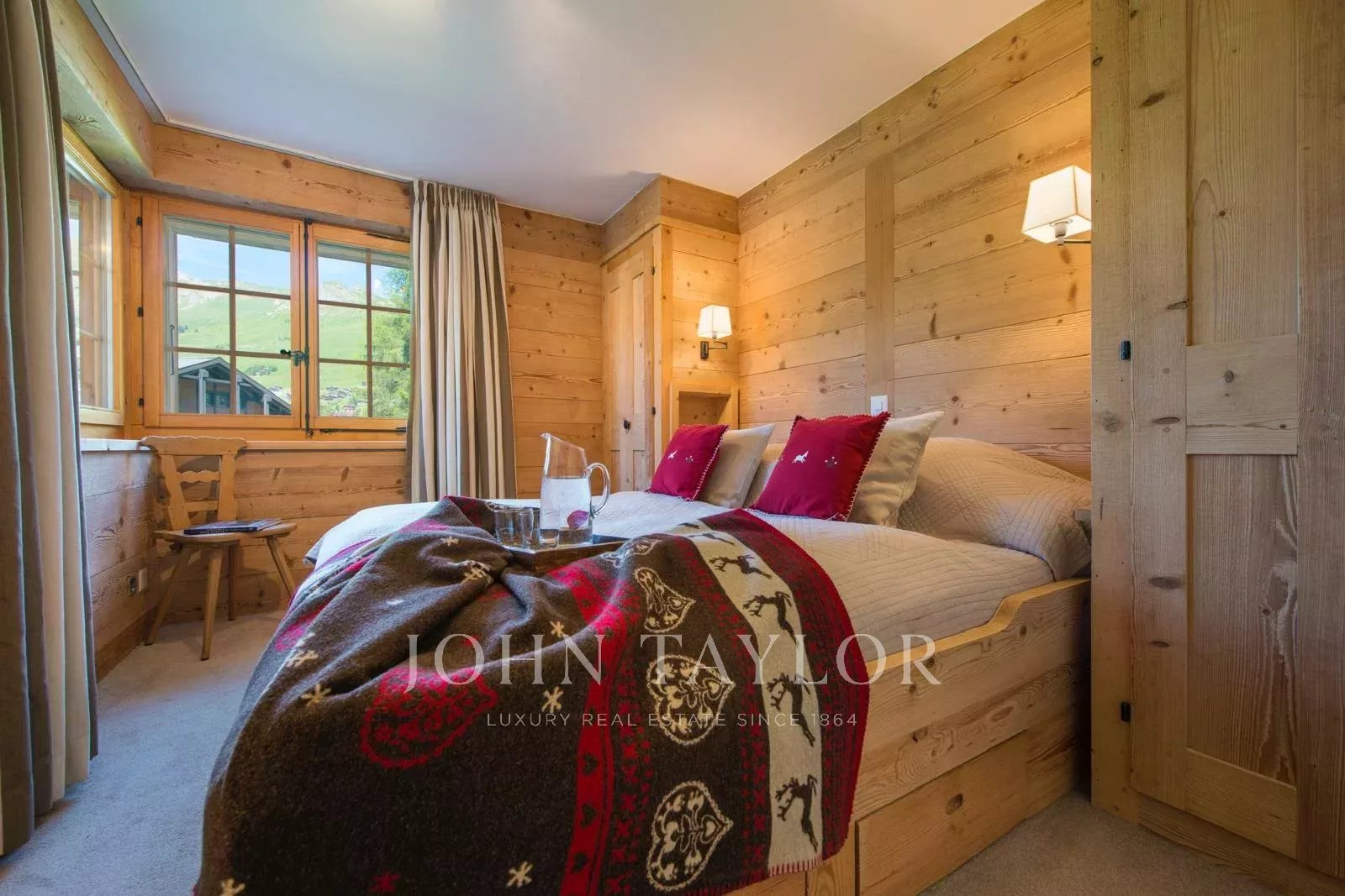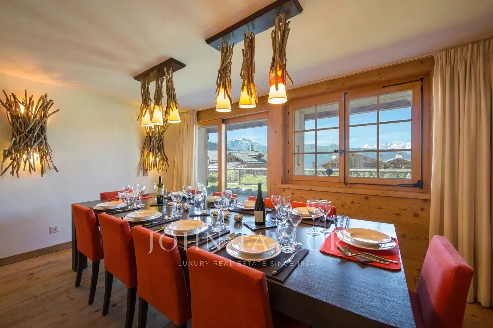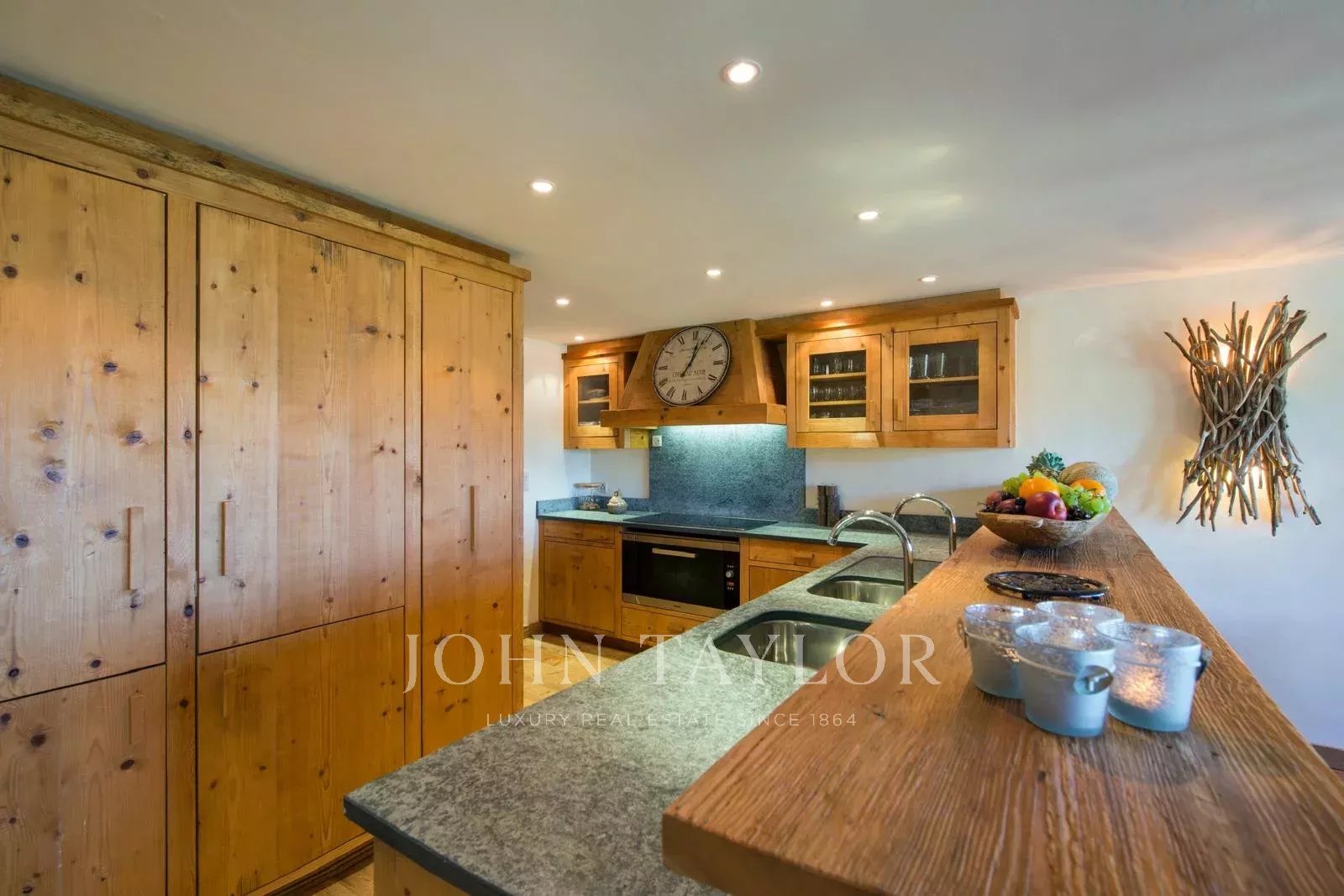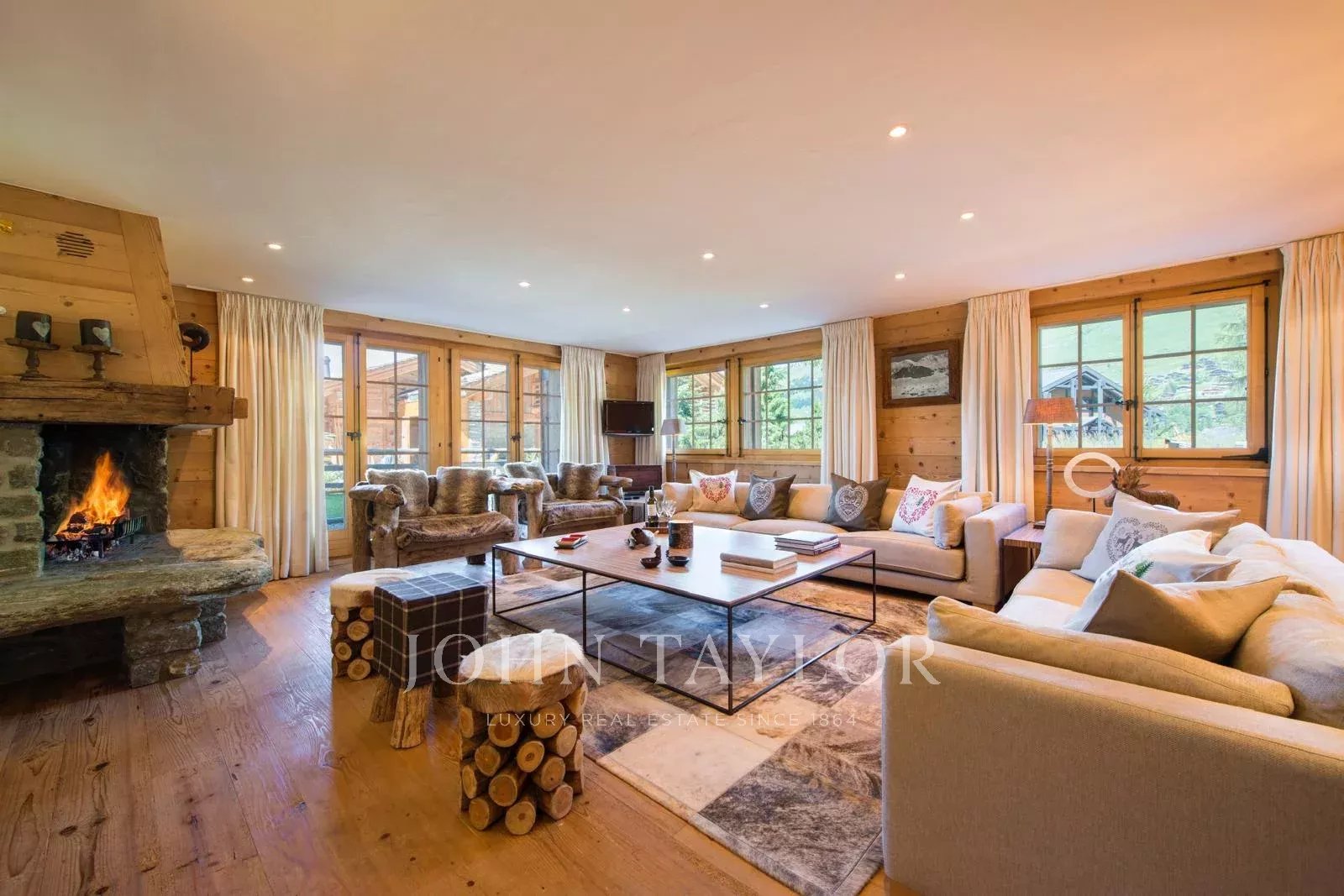 The apartment features a large, contemporary Alpine-style living room with a traditional stone fireplace. The kitchen opens onto the dining room, which overlooks the south-facing garden with superb mountain views.