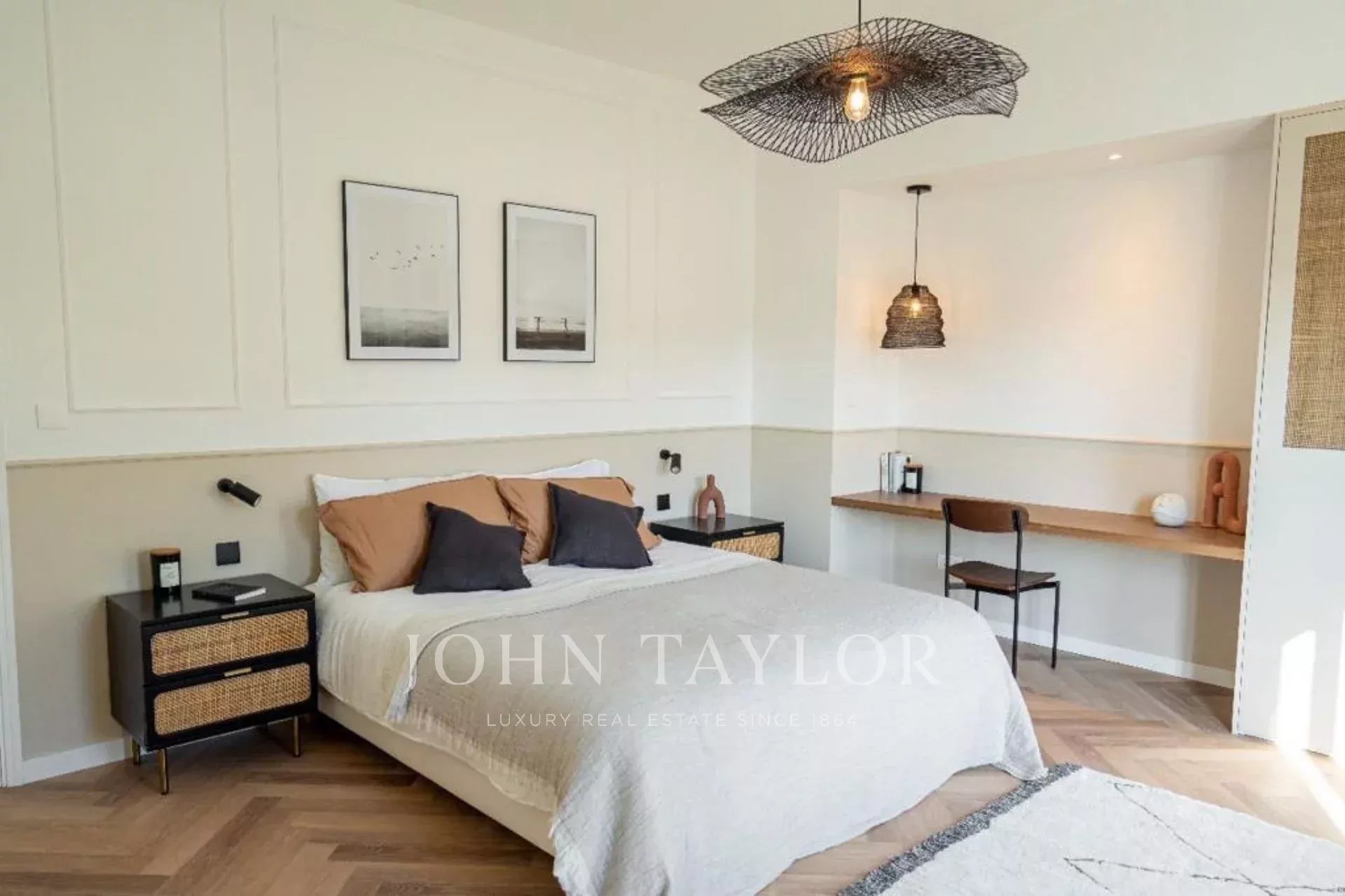 French influences shine through elegant moldings, Parisian hand-made lightings and handles, Art Deco glass walls, and herringbone wooden flooring. Modern acrylic artworks, designer furniture, and vibrant tones inject a fashionable element, promising a Dubai lifestyle elevated to a new level.