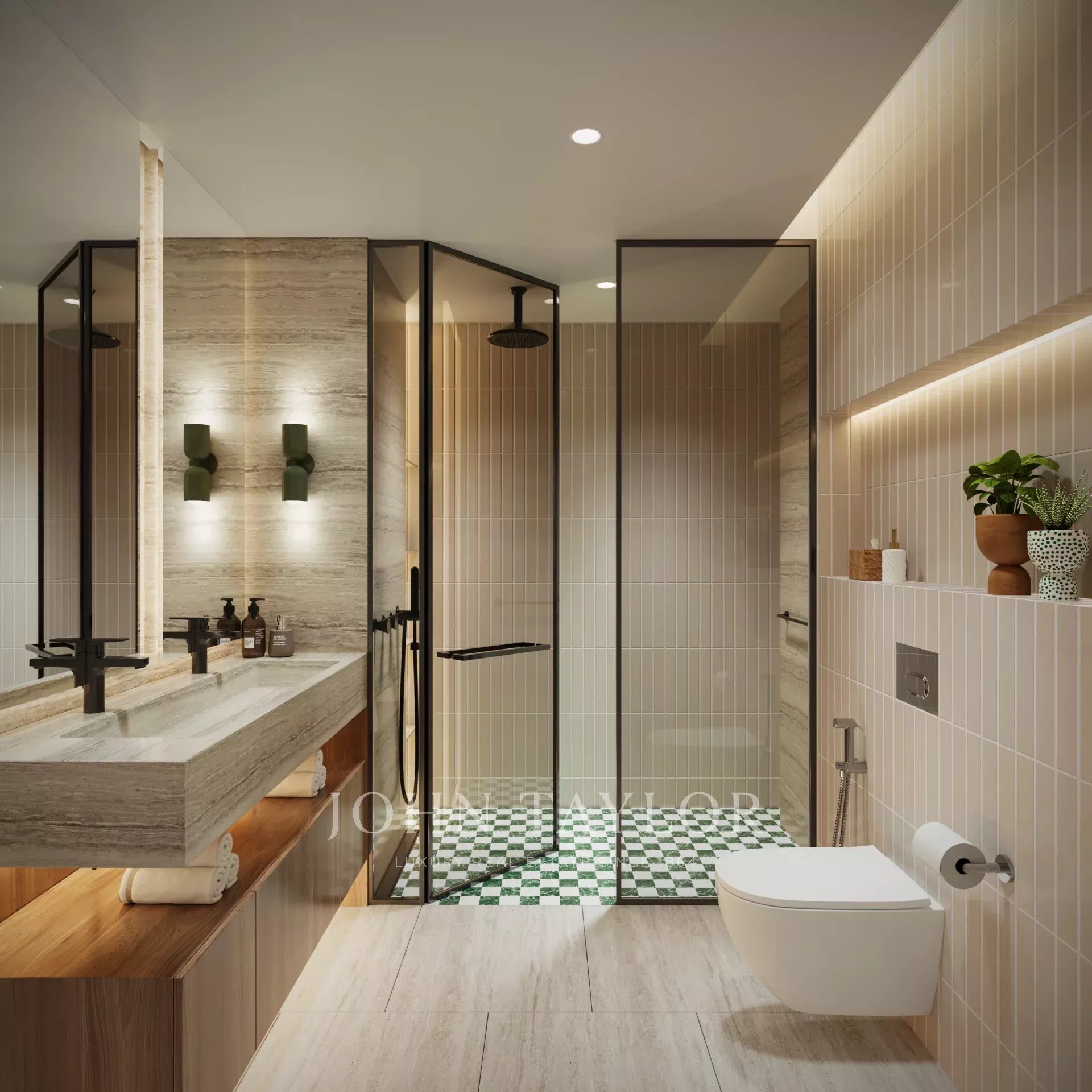 Elegant Bathroom: Luxuriously designed with premium fixtures and finishes, providing a sophisticated spa-like experience.