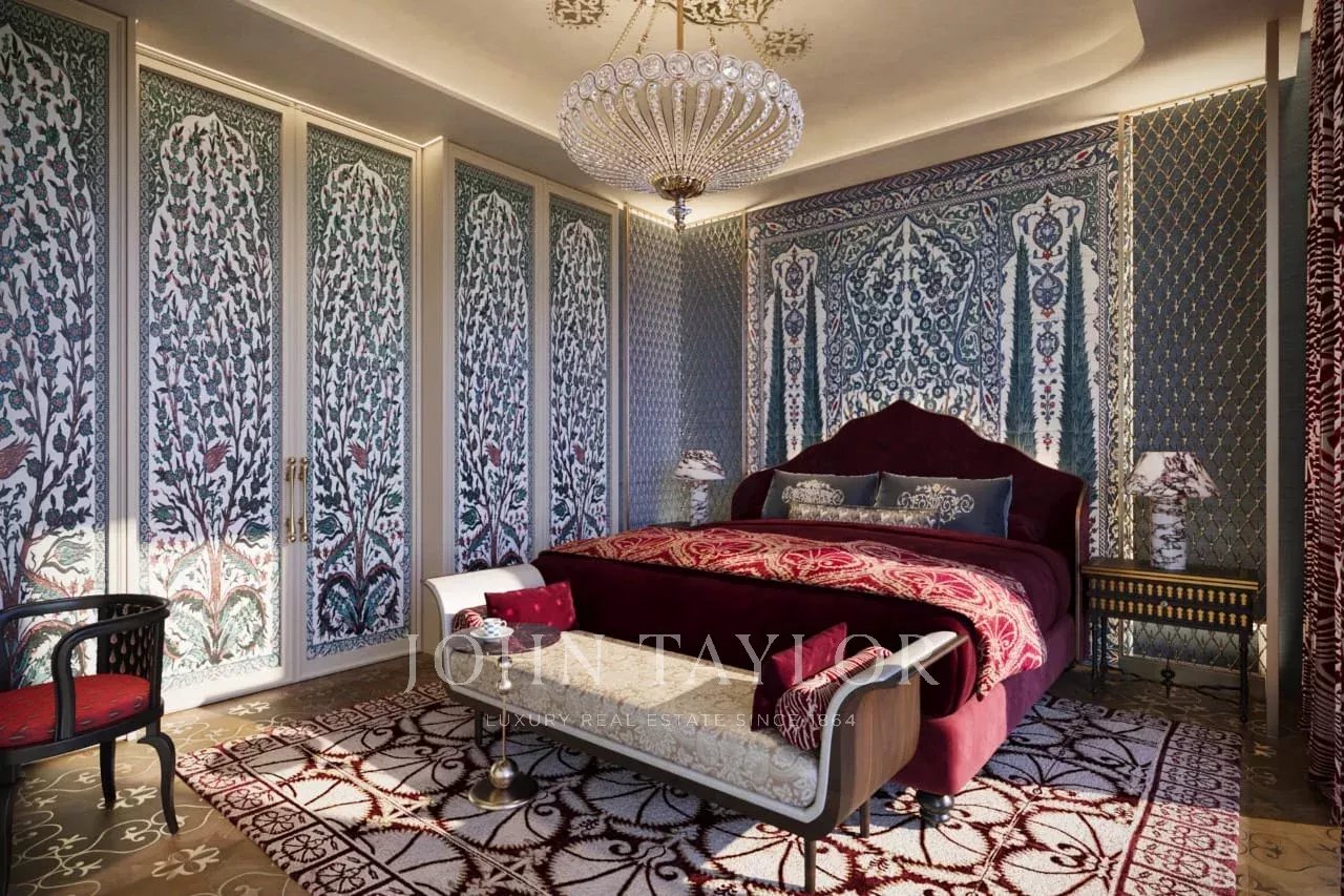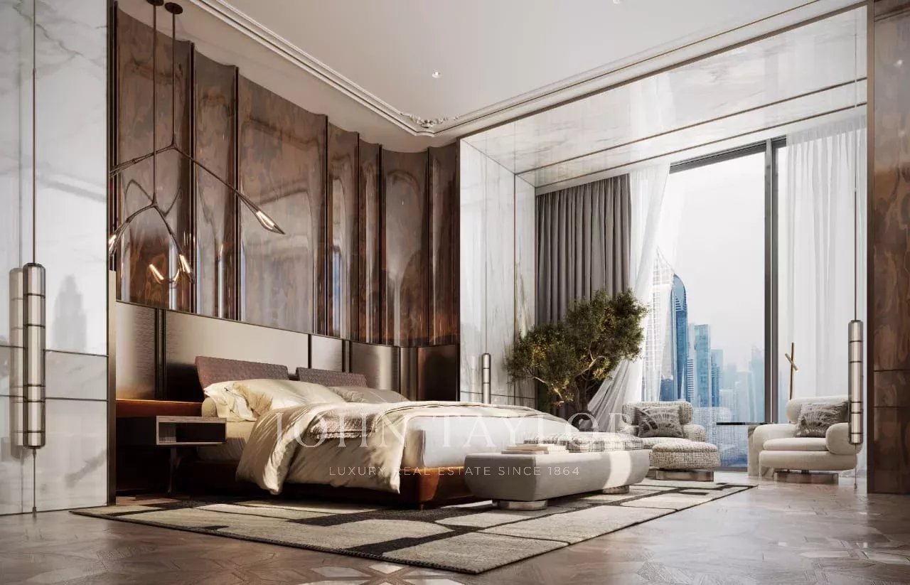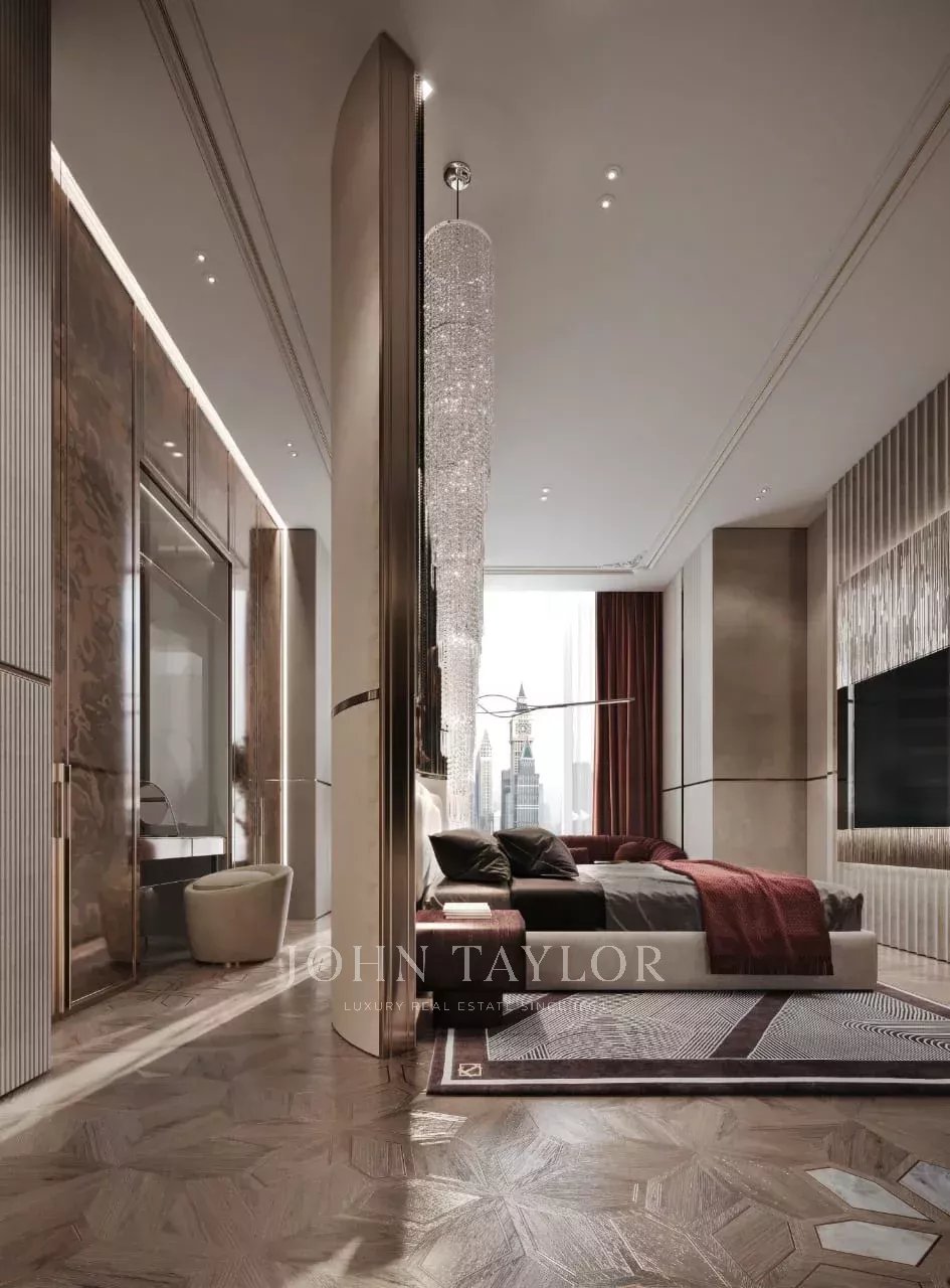 Master Suite: A luxurious master bedroom with a private en-suite bathroom, walk-in closet, and panoramic views of Dubai's skyline.