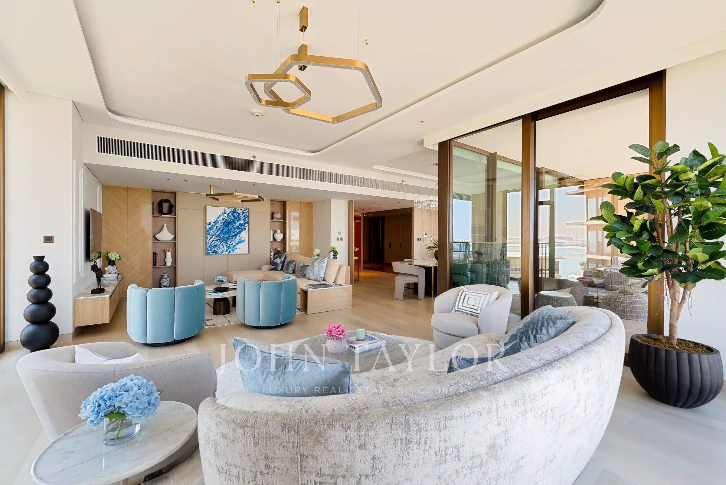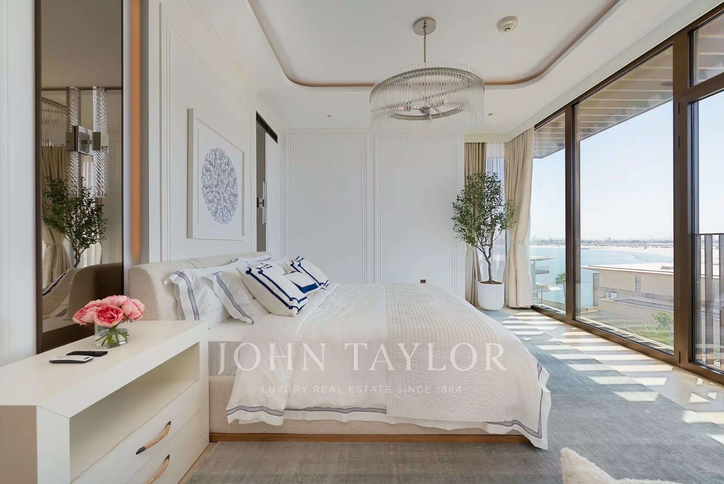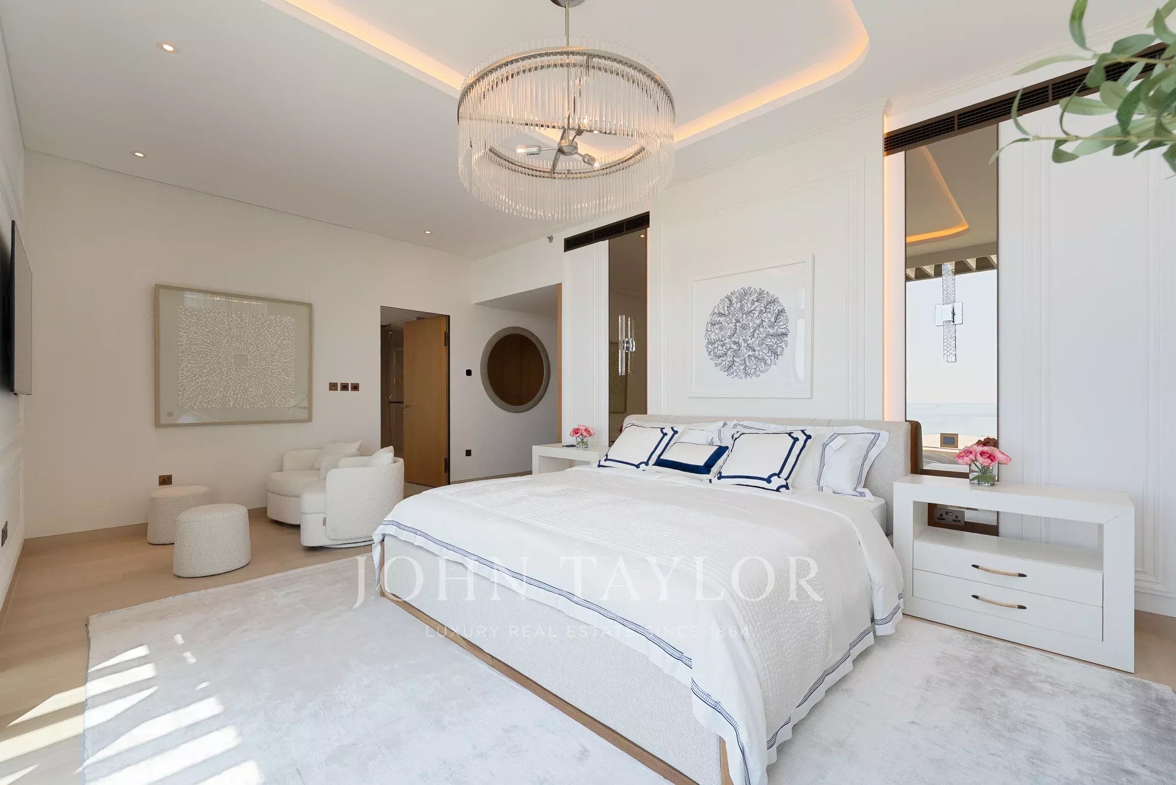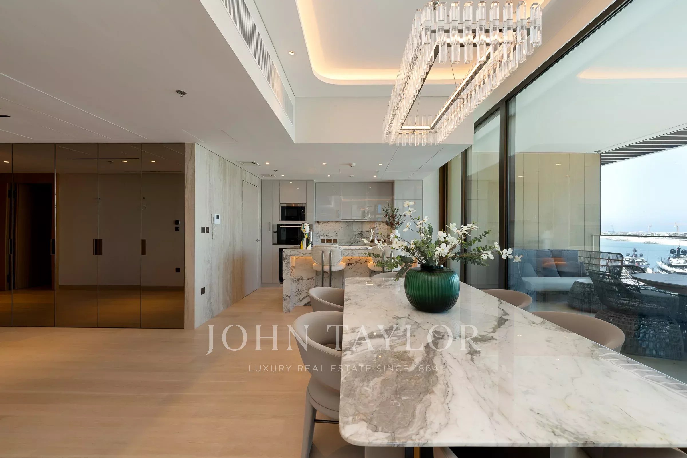 With a built-up area of 3,168 sq ft, this apartment in Bulgari Residences arrives full furnished. Styled in neutral tones of white, beige and blue, the home presents an inviting seaside retreat with marina views.