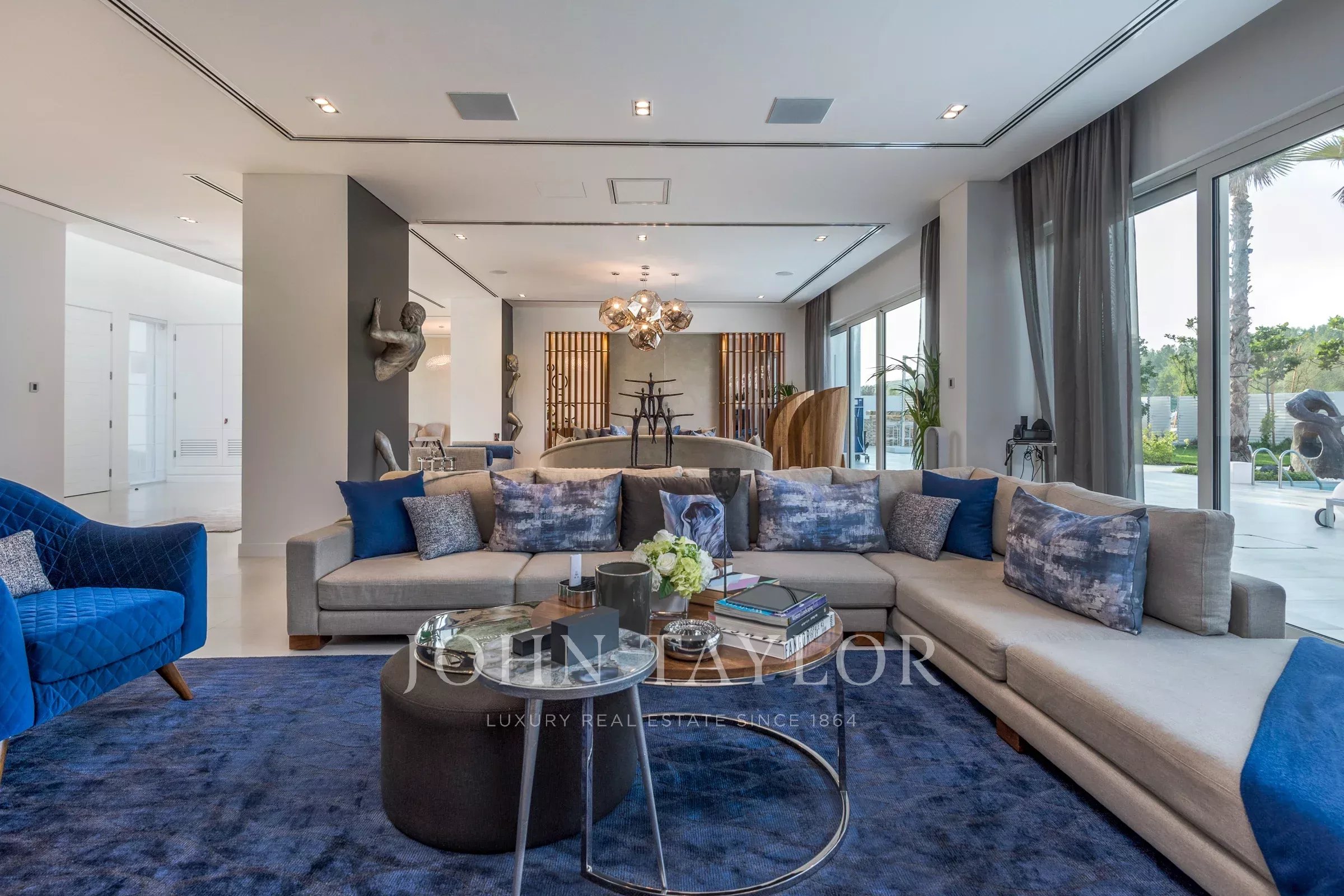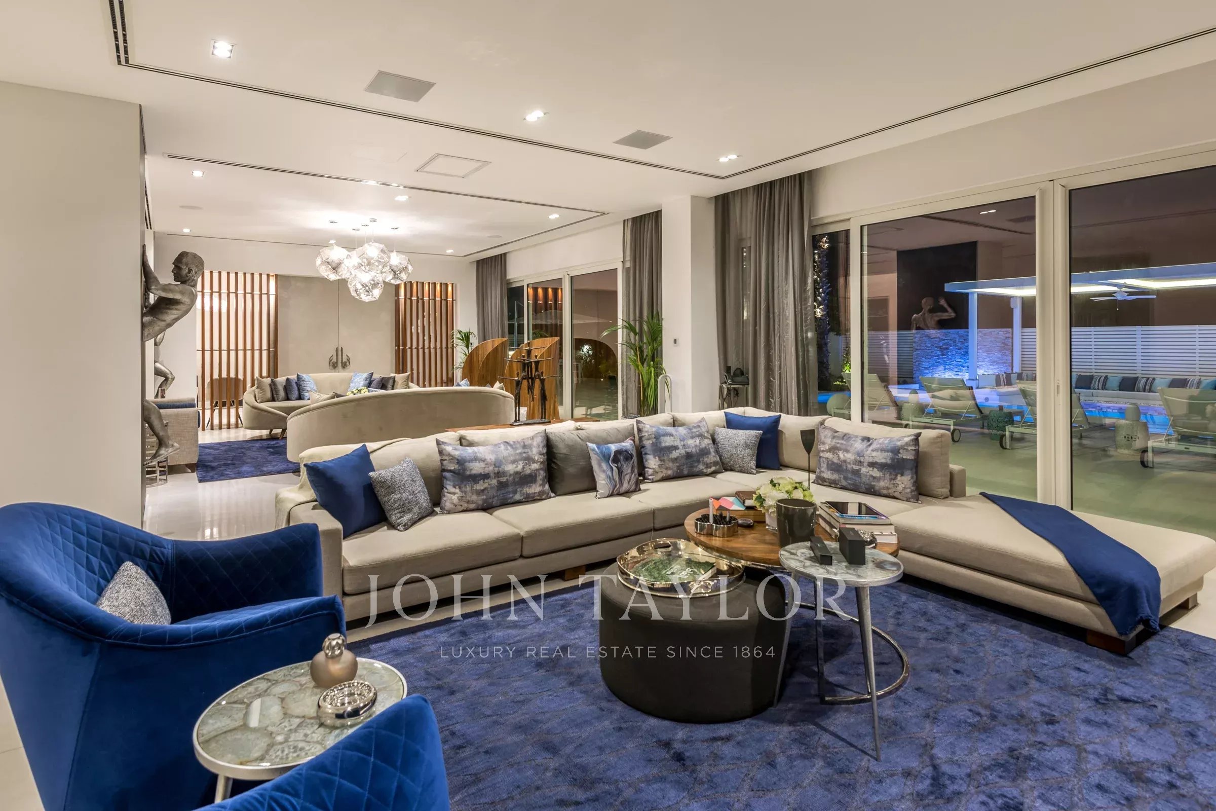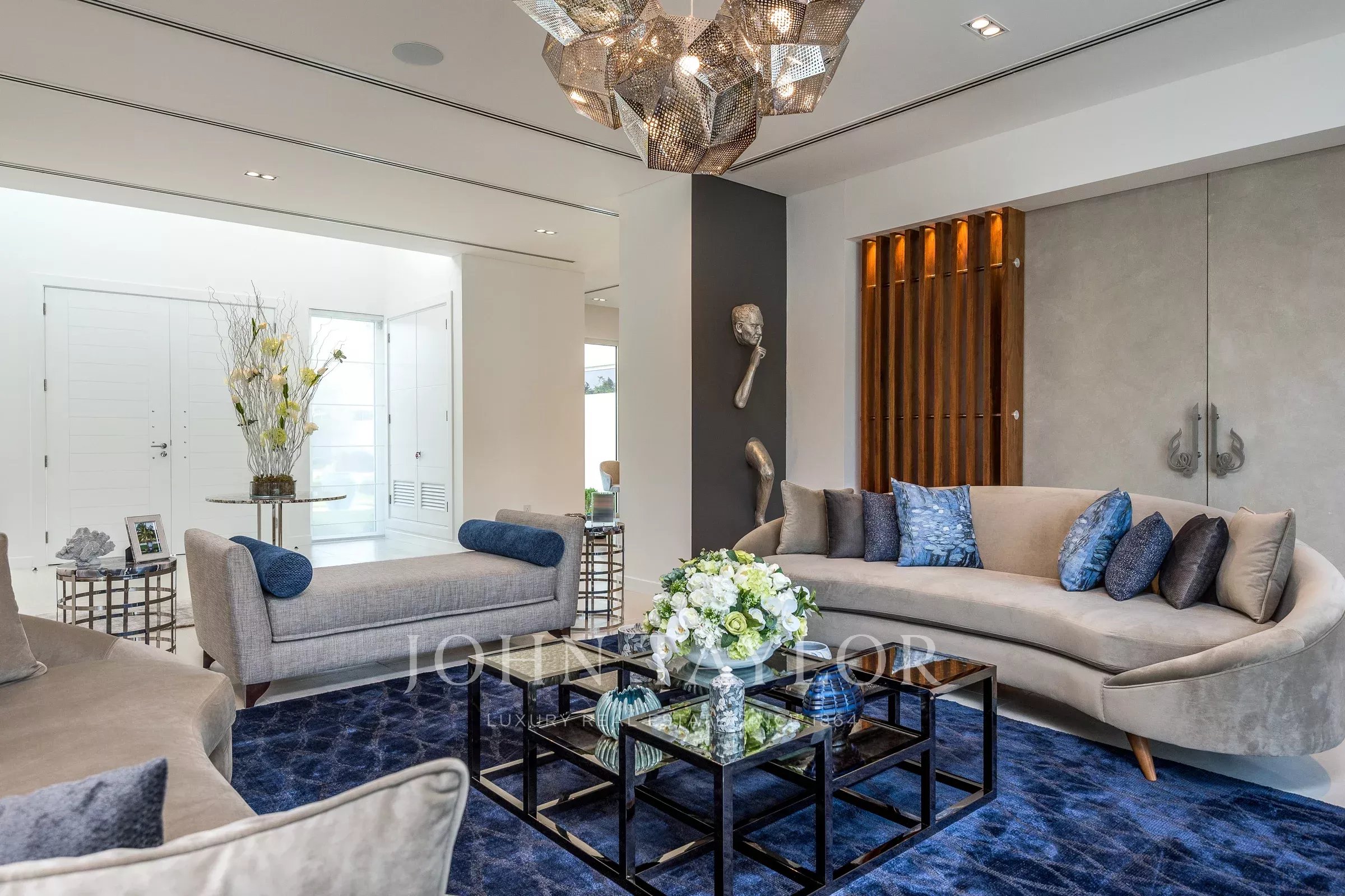 An entrance with a double heighted skylight leads you a gorgeous open plan living area with rich blue and silver touches and art that provides the centerpiece for conversations. A second living space overlooks the outdoor pool with seating area. The home also hosts a well-sized kitchen. The layout is built to bring the outdoors in. The home comprises of 5 generously sized ensuite bedrooms that all have their own distinct personality; one of which has been converted into a kid’s playroom. The master bedroom has its own lounge area with TV. There is also a massive outdoor lounge that overlooks the pool area.