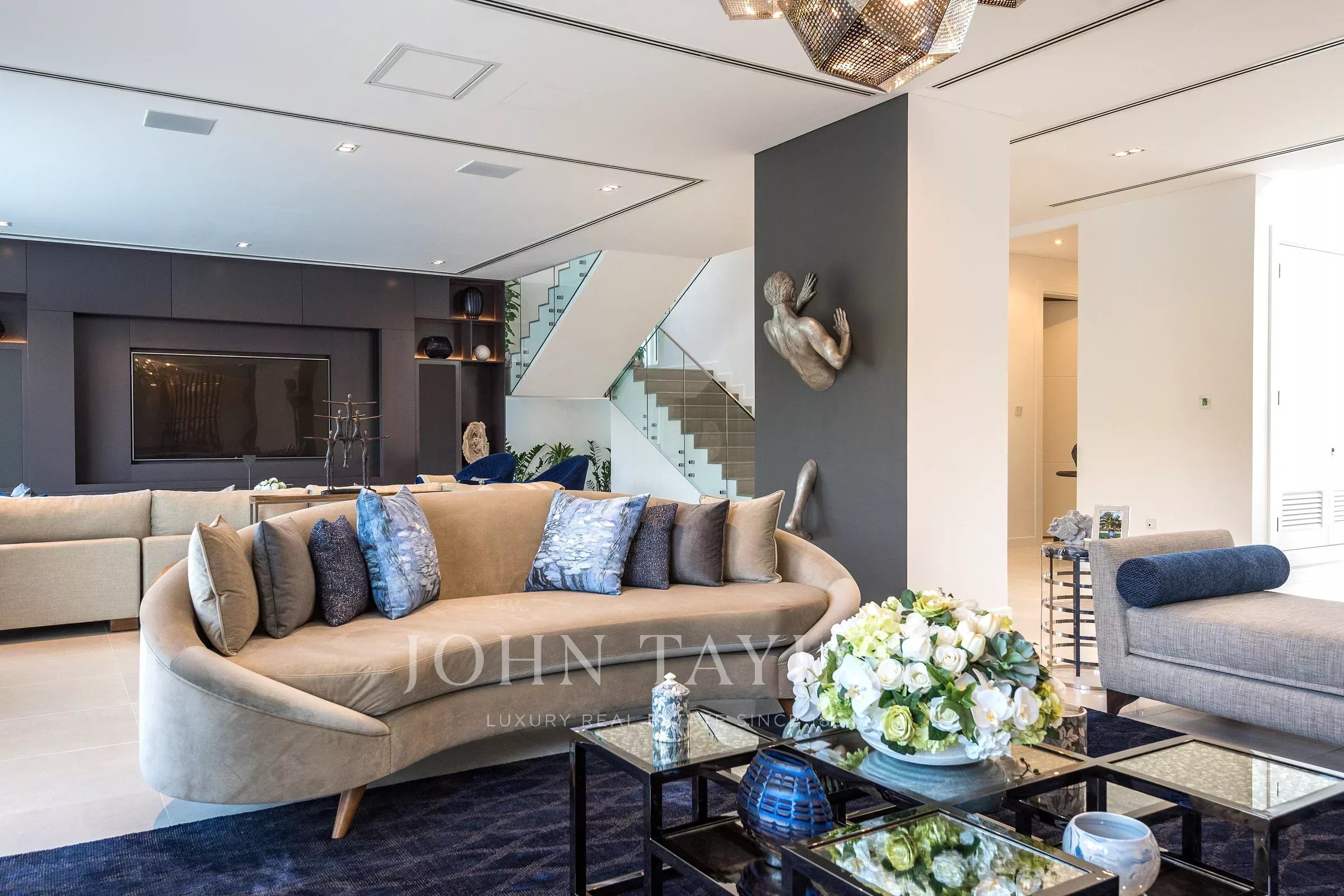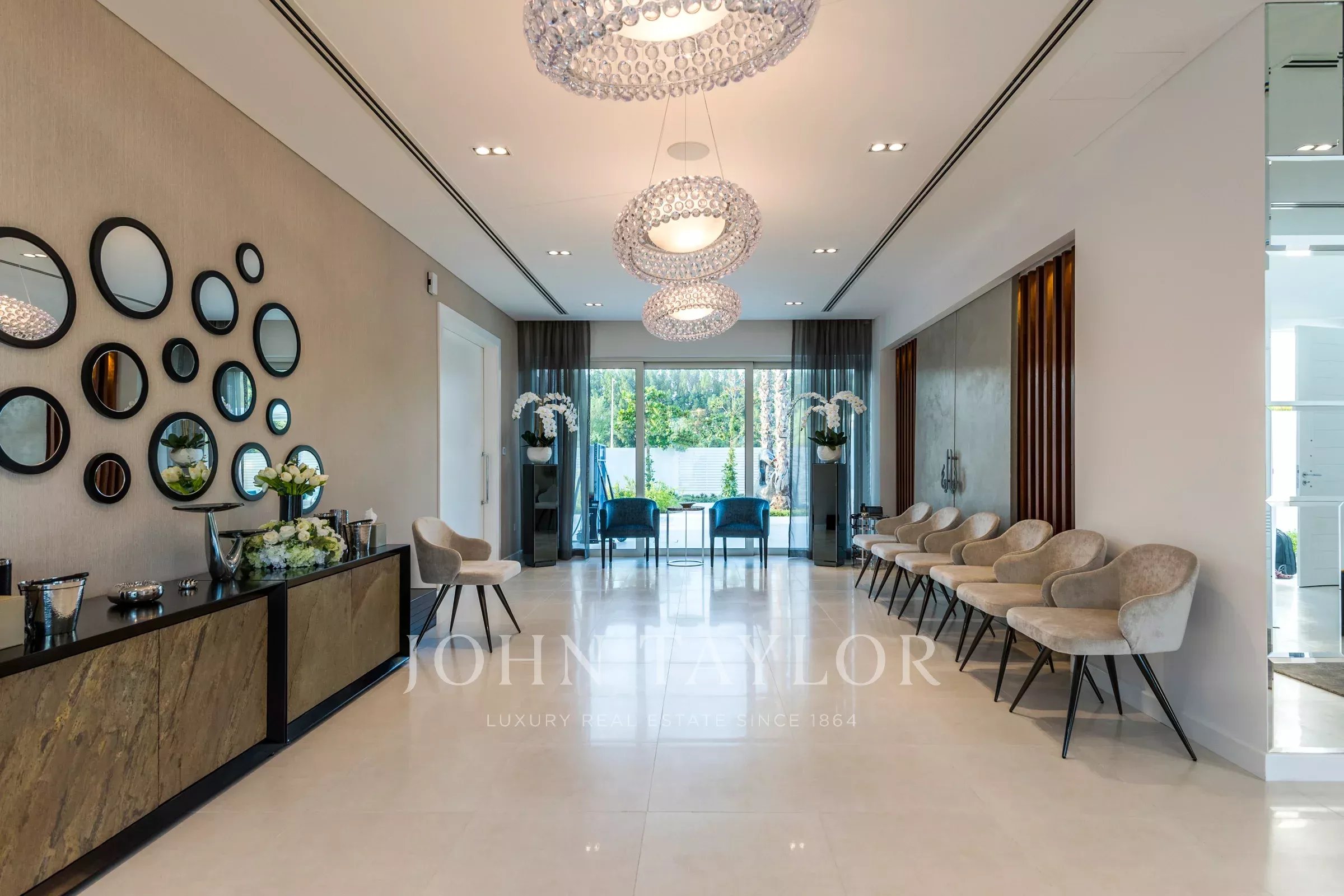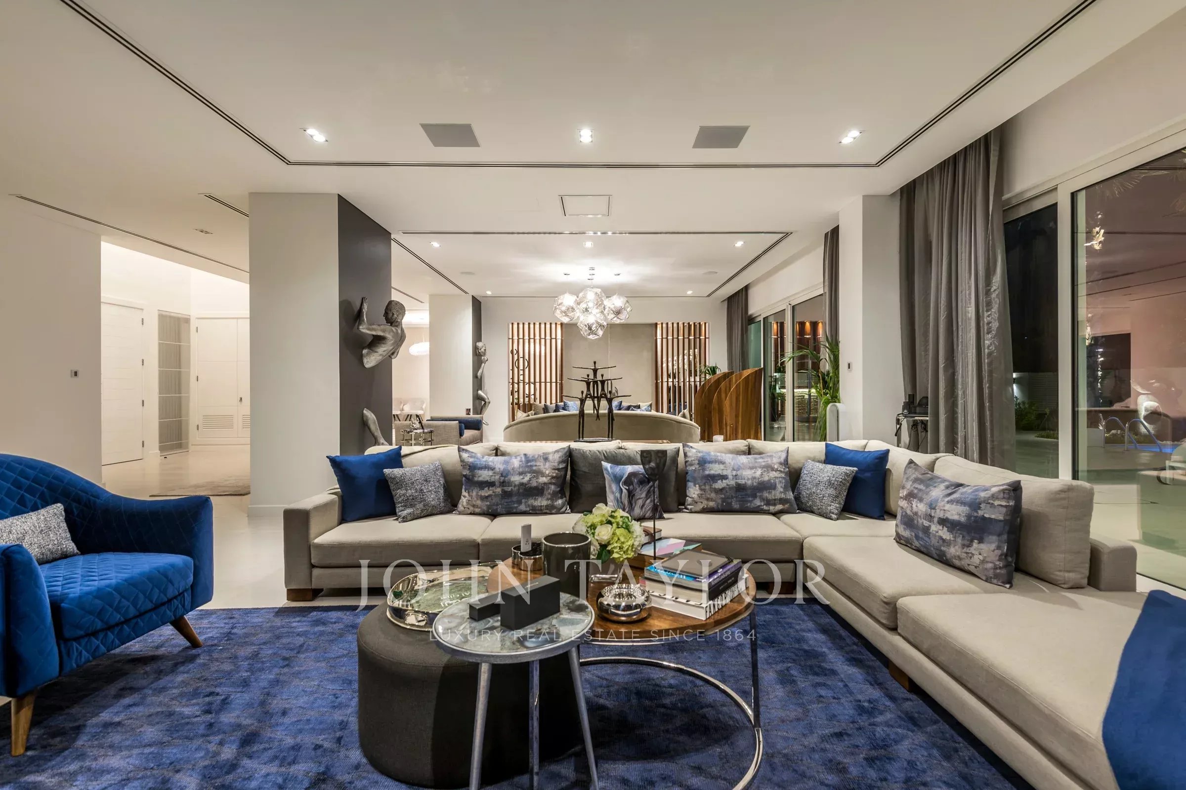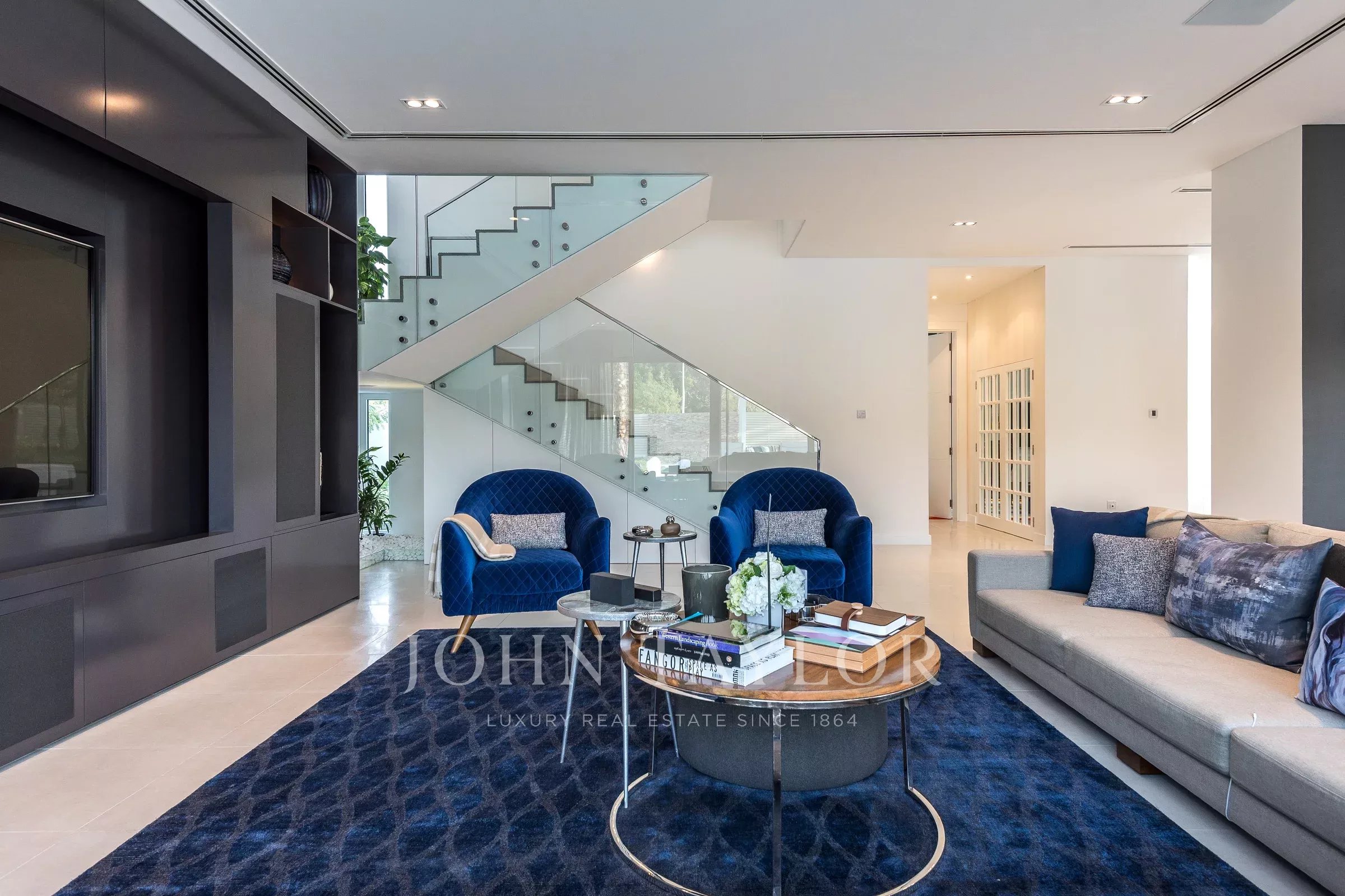 An entrance with a double heighted skylight leads you a gorgeous open plan living area with rich blue and silver touches and art that provides the centerpiece for conversations. A second living space overlooks the outdoor pool with seating area. The home also hosts a well-sized kitchen. The layout is built to bring the outdoors in. The home comprises of 5 generously sized ensuite bedrooms that all have their own distinct personality; one of which has been converted into a kid’s playroom. The master bedroom has its own lounge area with TV. There is also a massive outdoor lounge that overlooks the pool area.