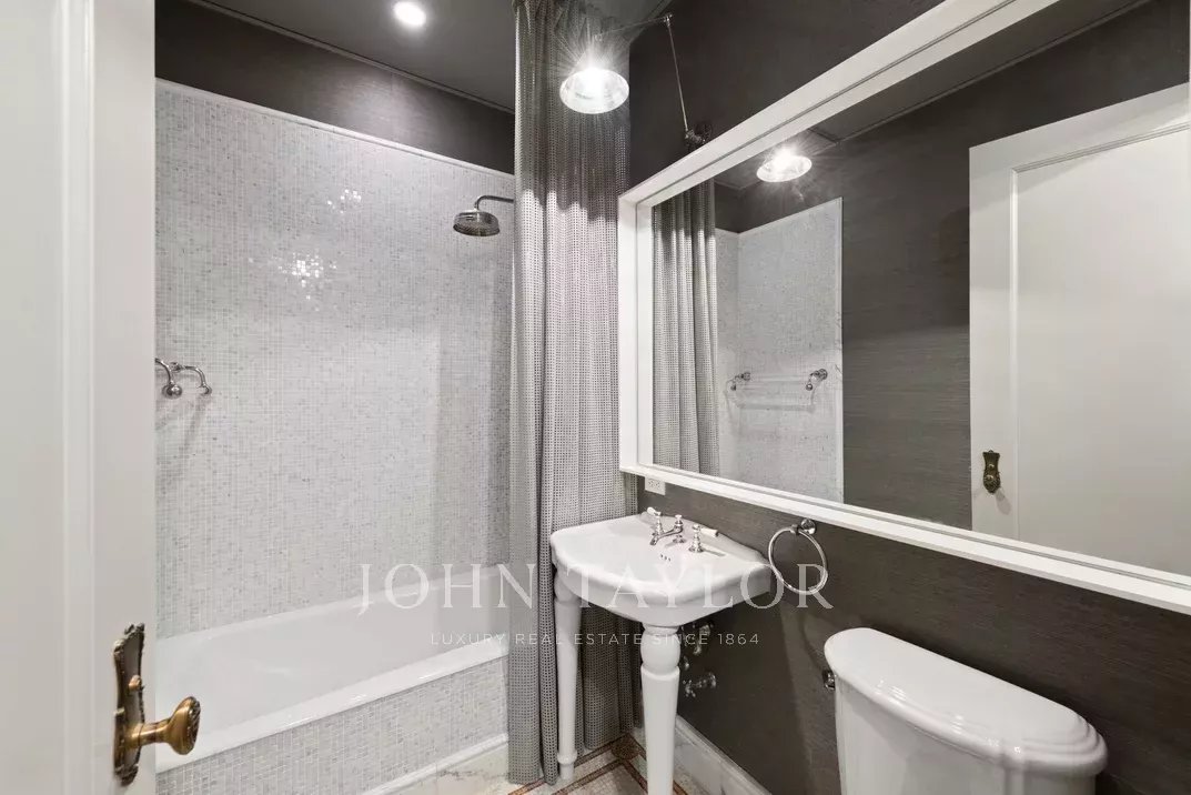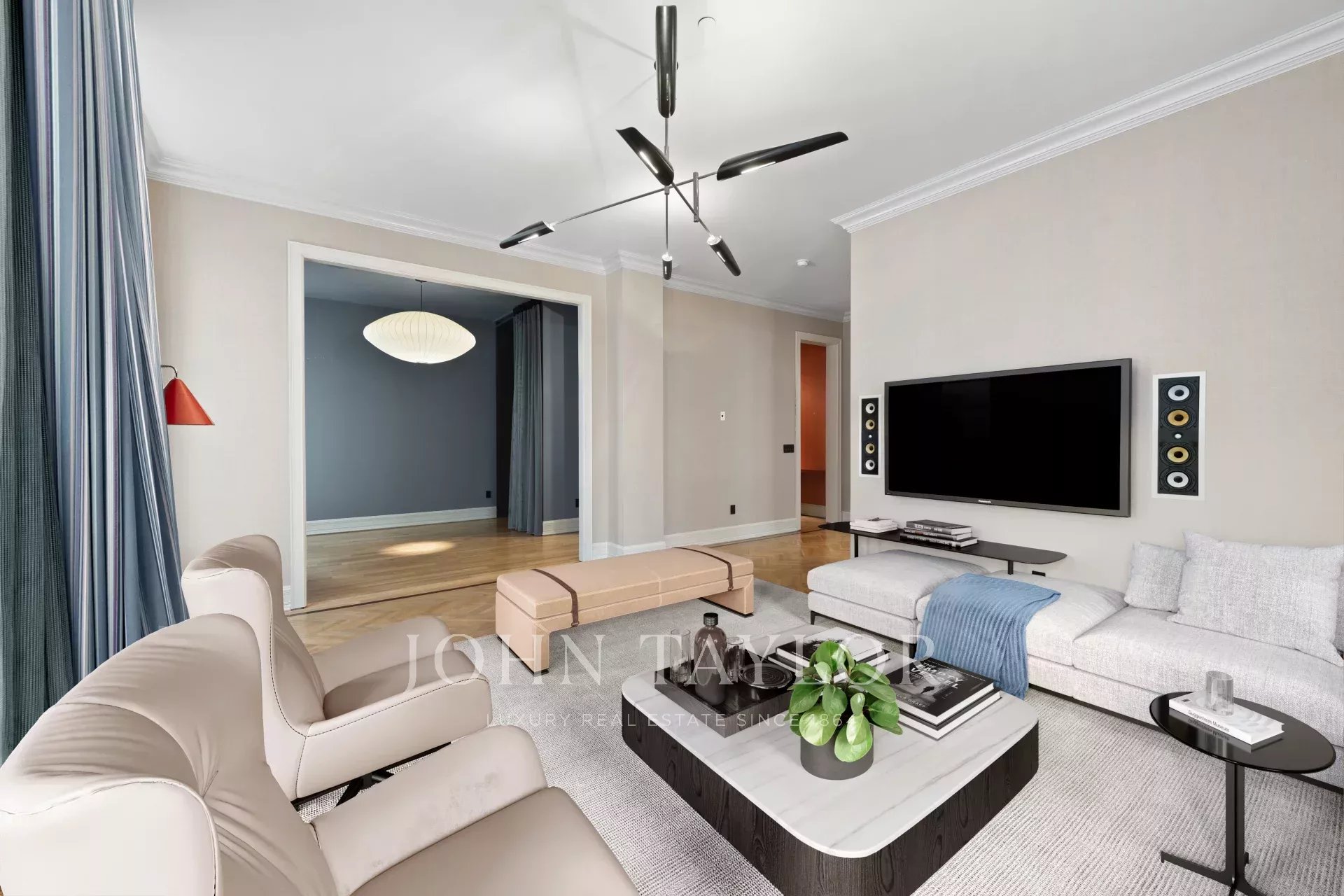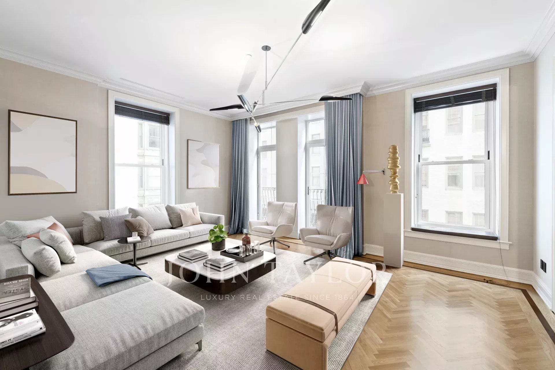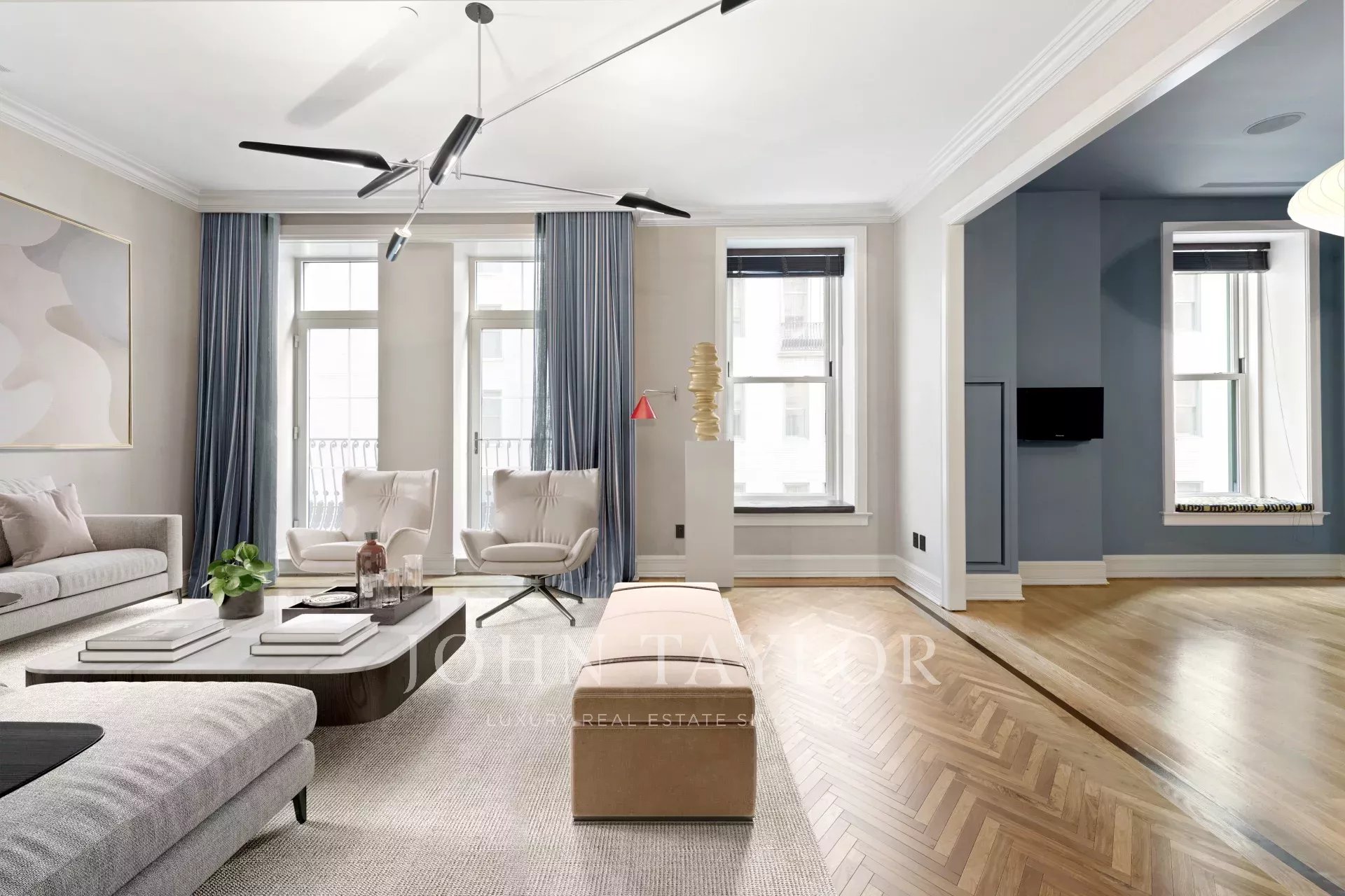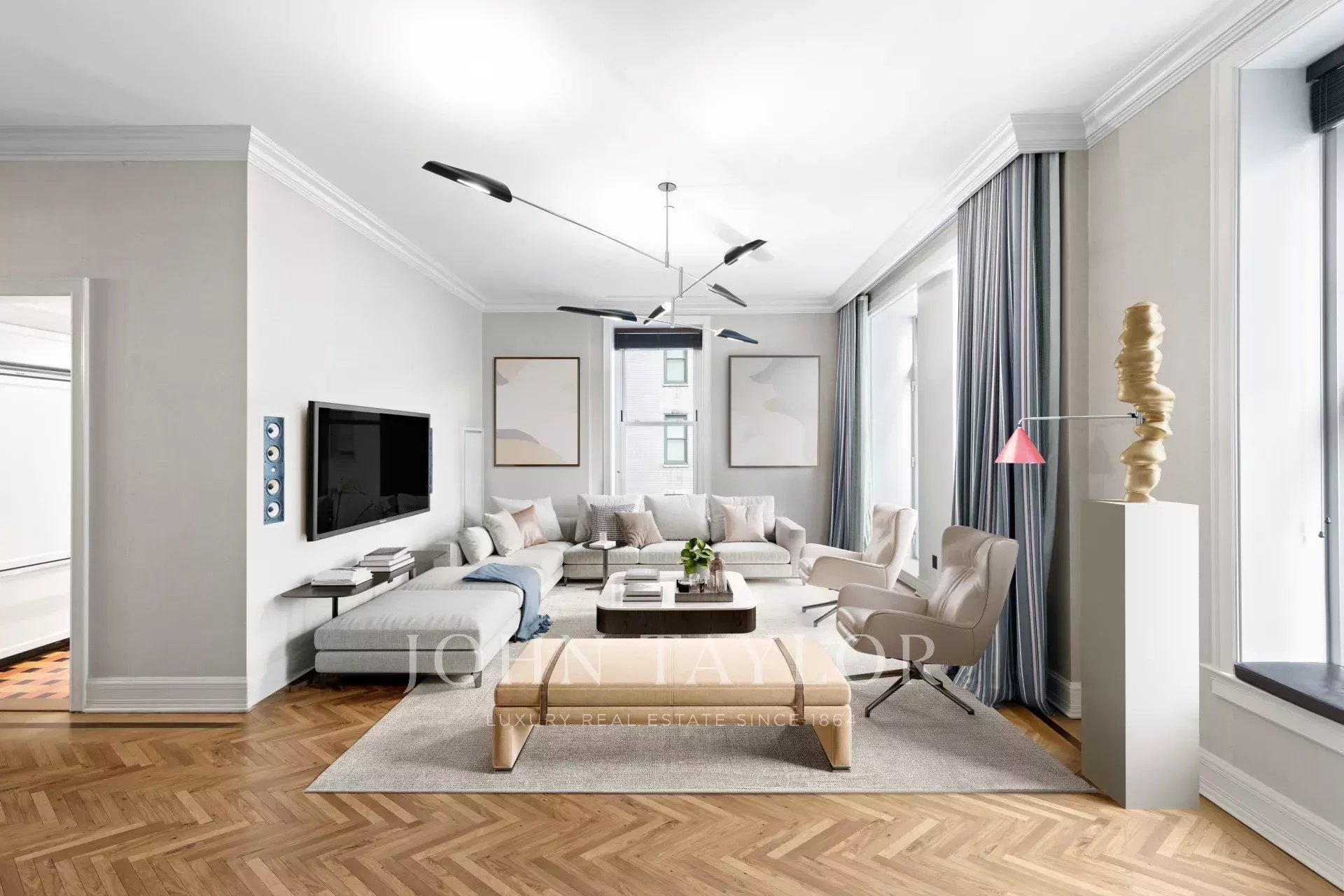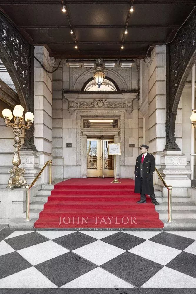 A magnificent two-bedroom residence at the iconic Plaza Private Residences. This beautiful home features 11 foot high ceilings, hardwood herringbone floors, and pre-war detail throughout. Additional features of the home include a large master bedroom with beautifully finished walk-in closets and a Juliette balcony. The living room features a Juliette balcony as well allowing an abundance of sunlight to enter the home. The kitchen features custom Nero Marquina stone countertops, Calacatta white mosaic marble backsplash, and Plaza Collection appliances by Viking and Miele. The custom Plaza Bathroom includes double sinks, a separate shower stall, a soaking tub, and an original marble mosaic pattern derived from the historic Plaza lobbies. The air and heat are central and unified with 3 zones of control and venting which has been replaced in favor of quieter, above-window units. There is a washer/dryer.
