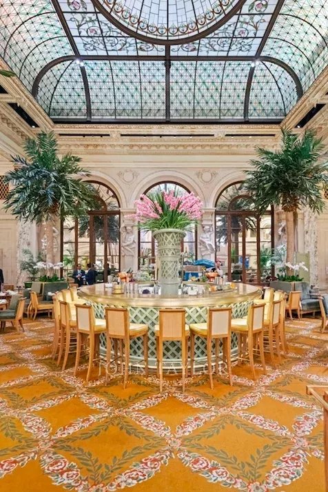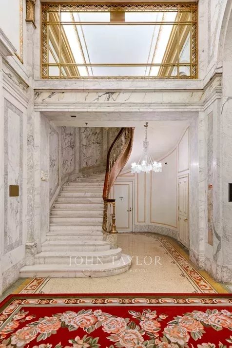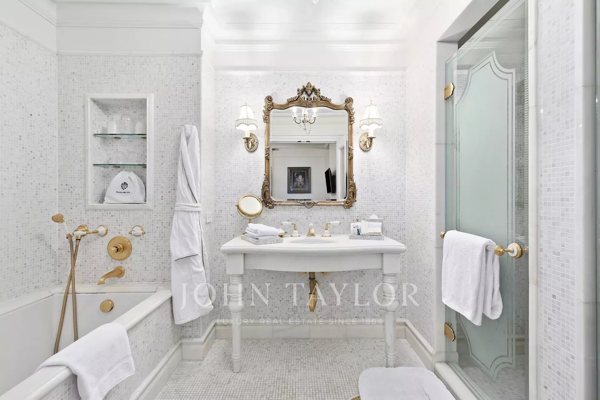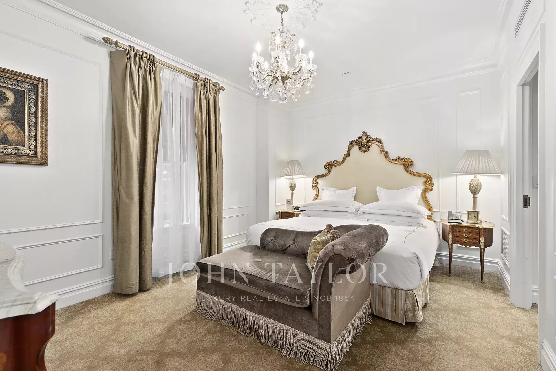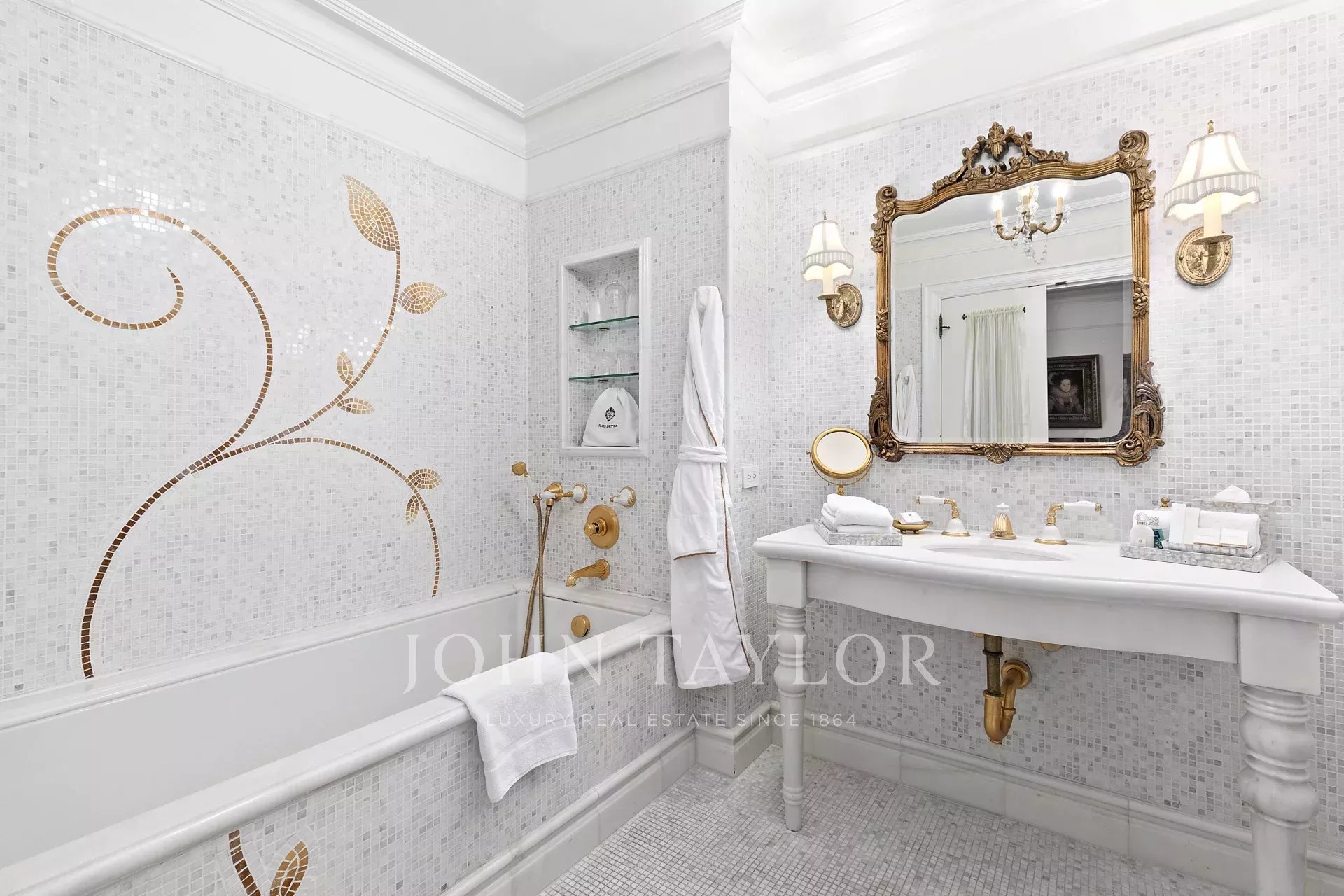 Rose Suite 1329 at the iconic Plaza Hotel has a spacious sitting room with a wet bar, Butler's pantry, and sliding doors leading to the King size bedroom suite with a separate dressing area to allow complete privacy. The suite overlooks 58th Street with southern exposures from both the living and bedroom. The gorgeous primary complete with a deep soaking tub is finished in 24-carat gold plated Sherle Wagner faucets and decorated with marble mosaic tile in a leaf-like pattern inspired by Central Park. The exquisite furnishings throughout the suite are classic Louis XV style.