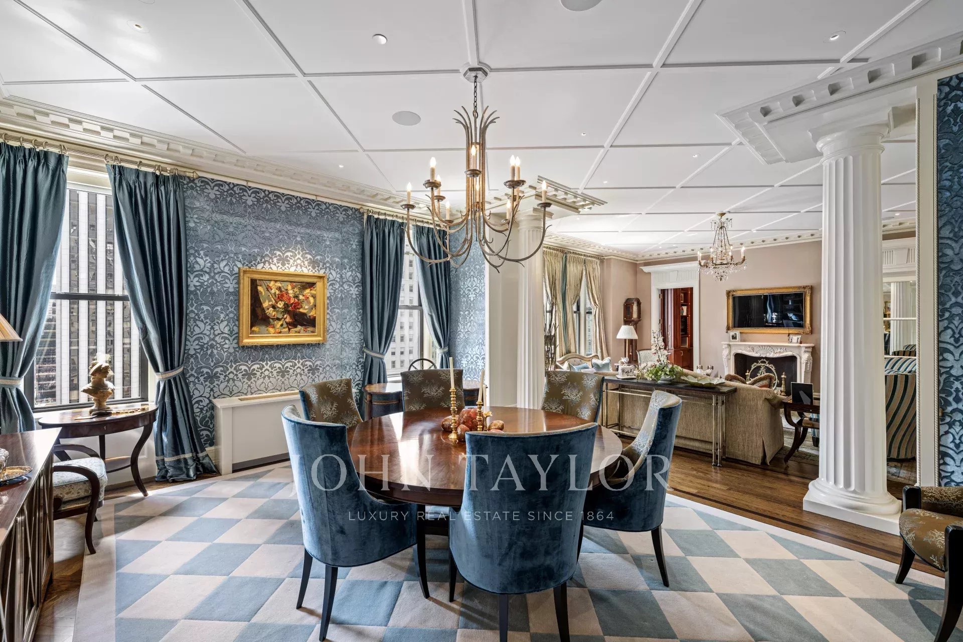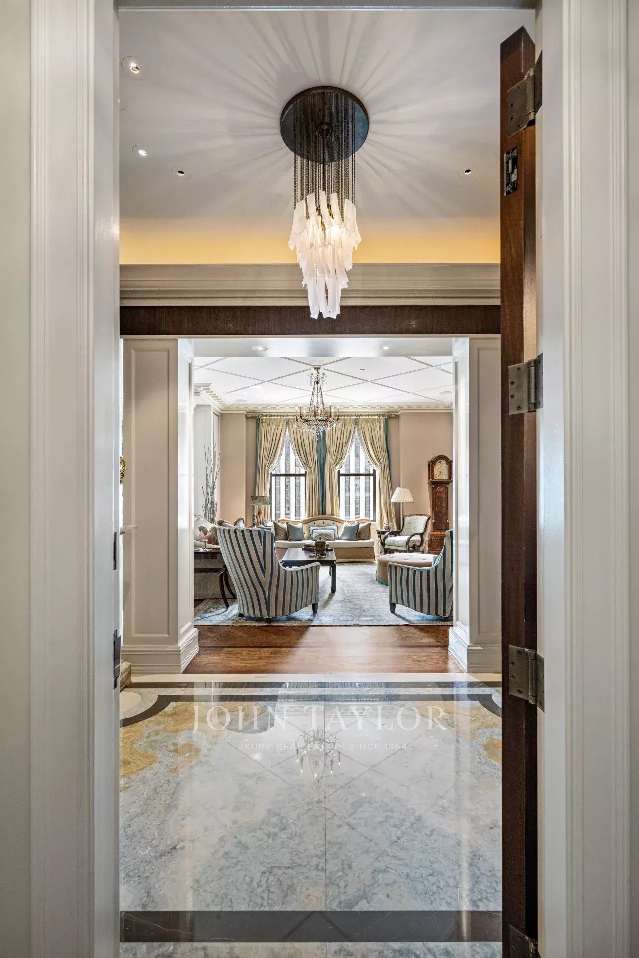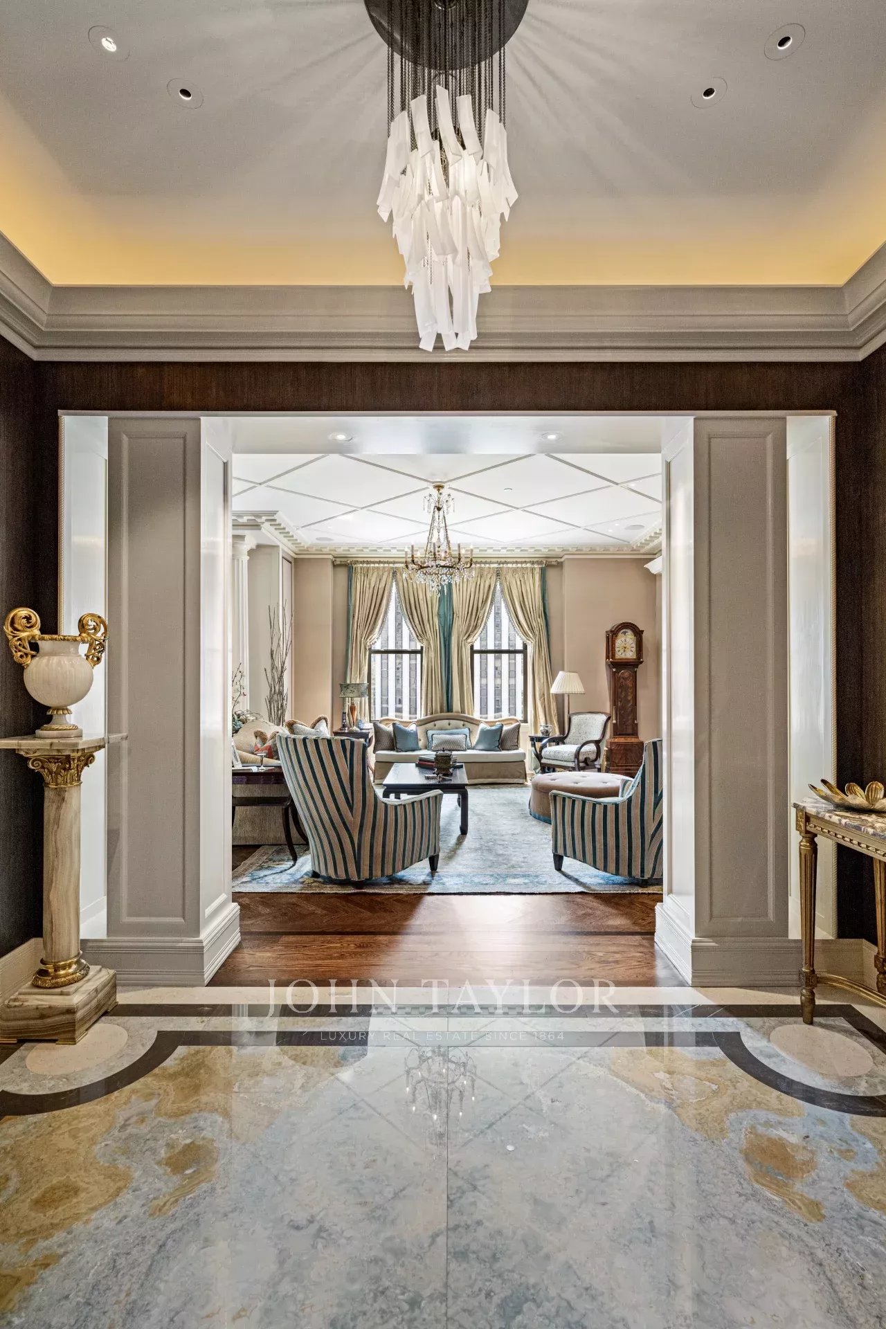 As you step into the graceful foyer, you are greeted by custom onyx flooring in serene hues reminiscent of the sea and sand. Enhancing the foyer's grandeur are two columns that frame the remarkable living room, offering breathtaking views of the historic Grand Army Plaza and Fifth Avenue.