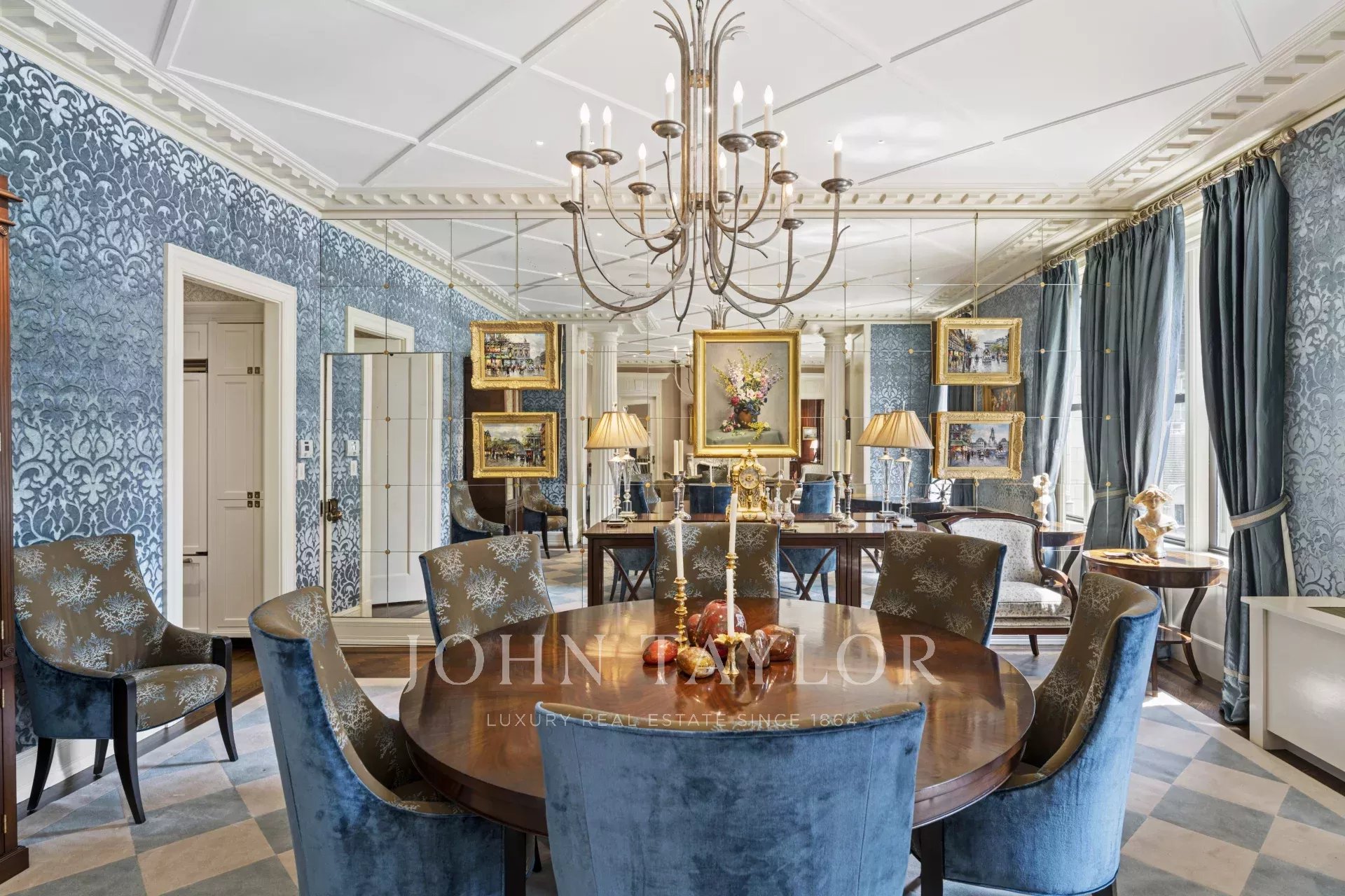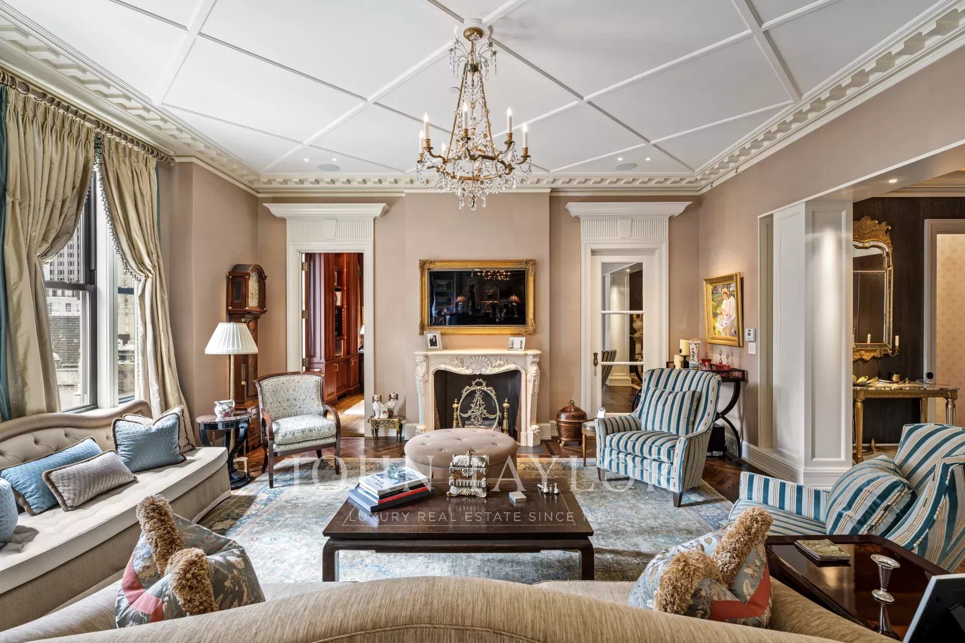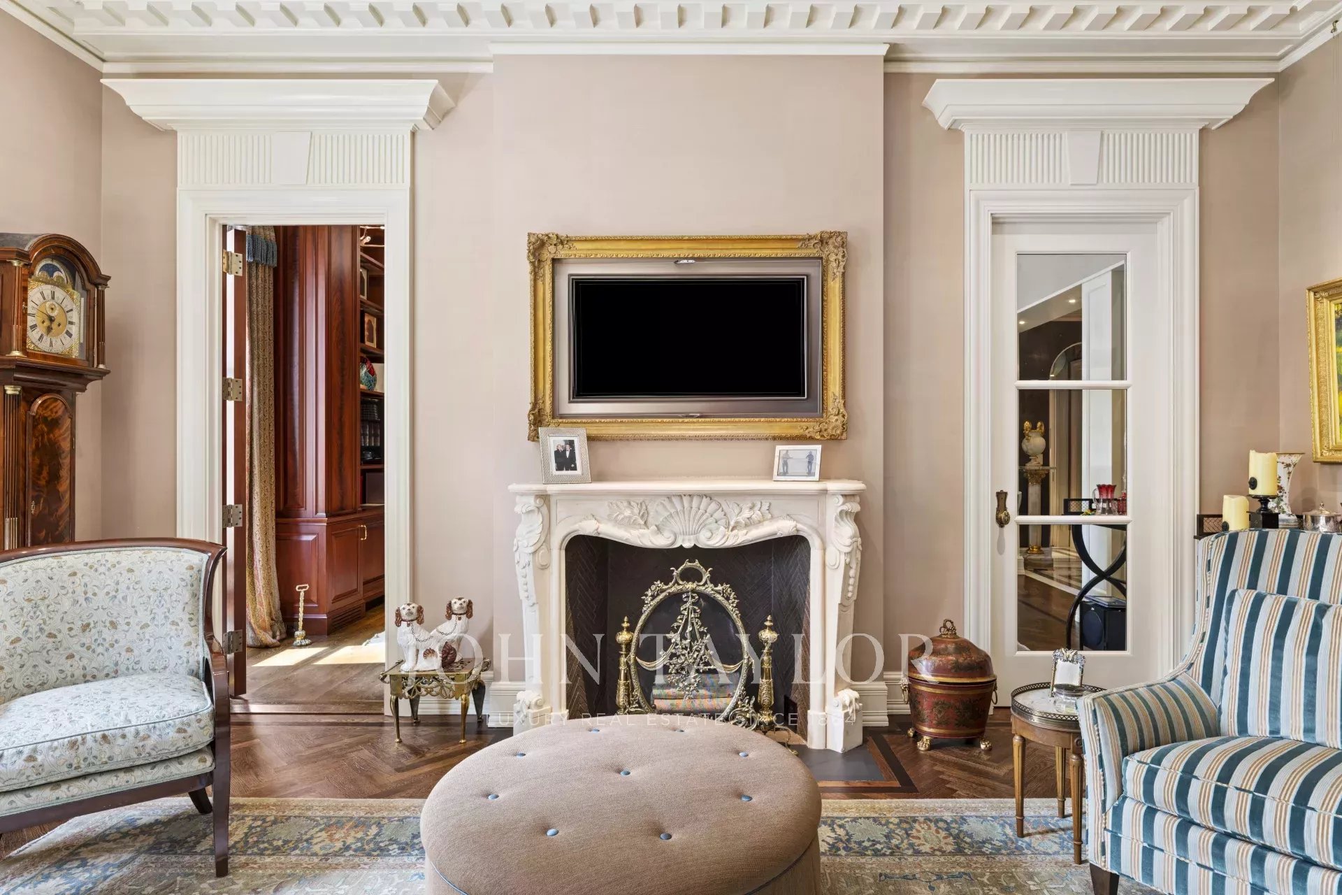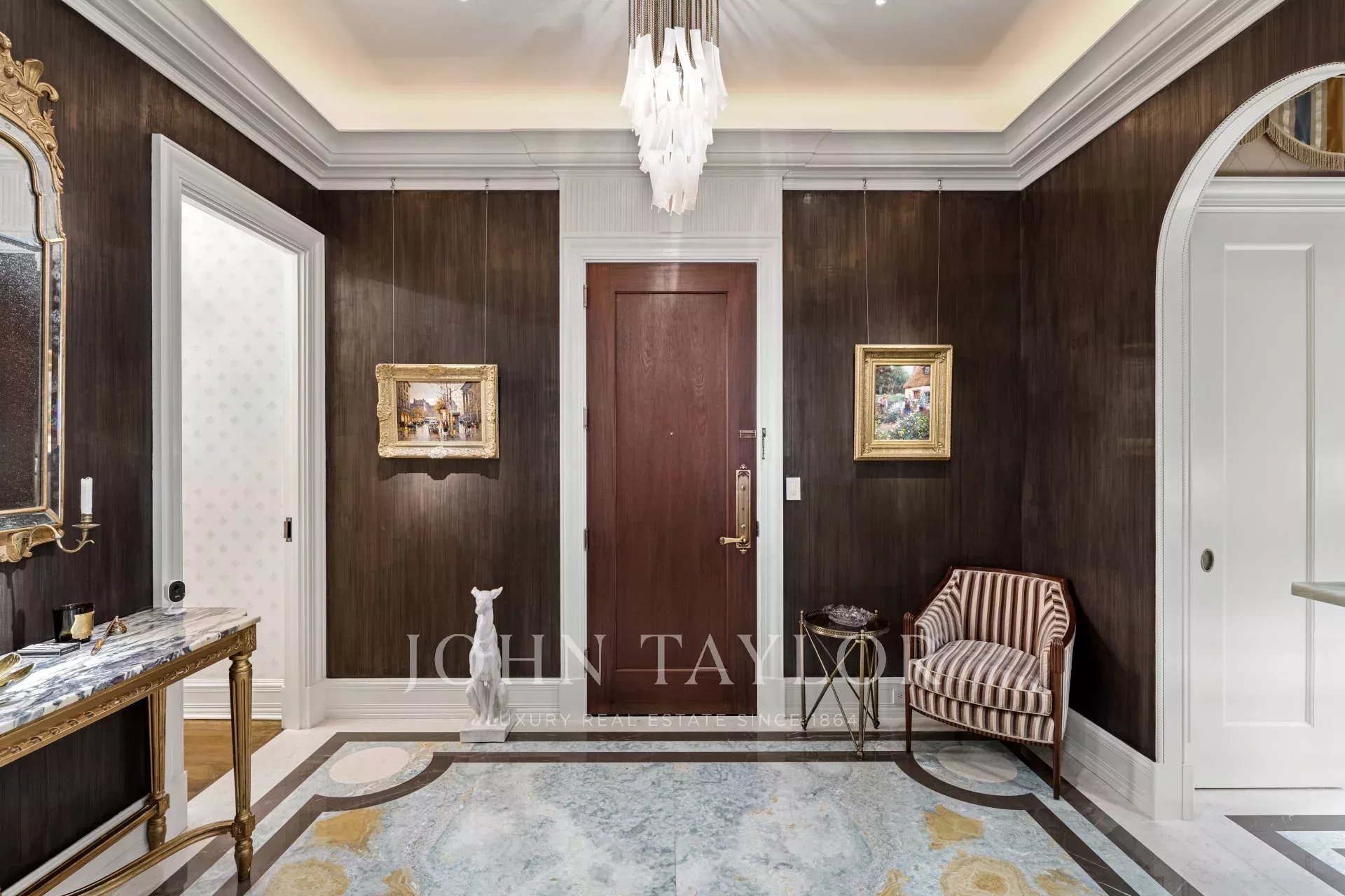As you step into the graceful foyer, you are greeted by custom onyx flooring in serene hues reminiscent of the sea and sand. Enhancing the foyer's grandeur are two columns that frame the remarkable living room, offering breathtaking views of the historic Grand Army Plaza and Fifth Avenue.