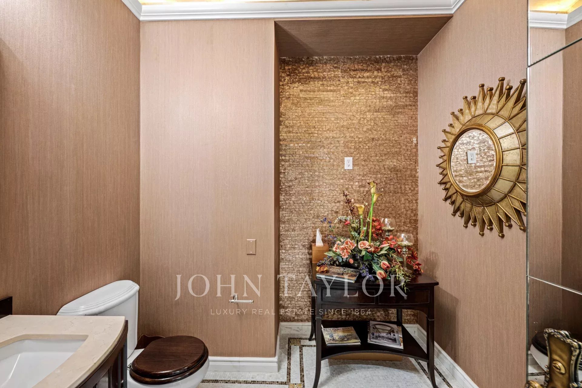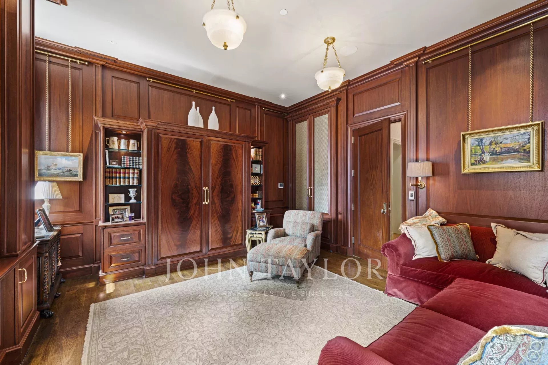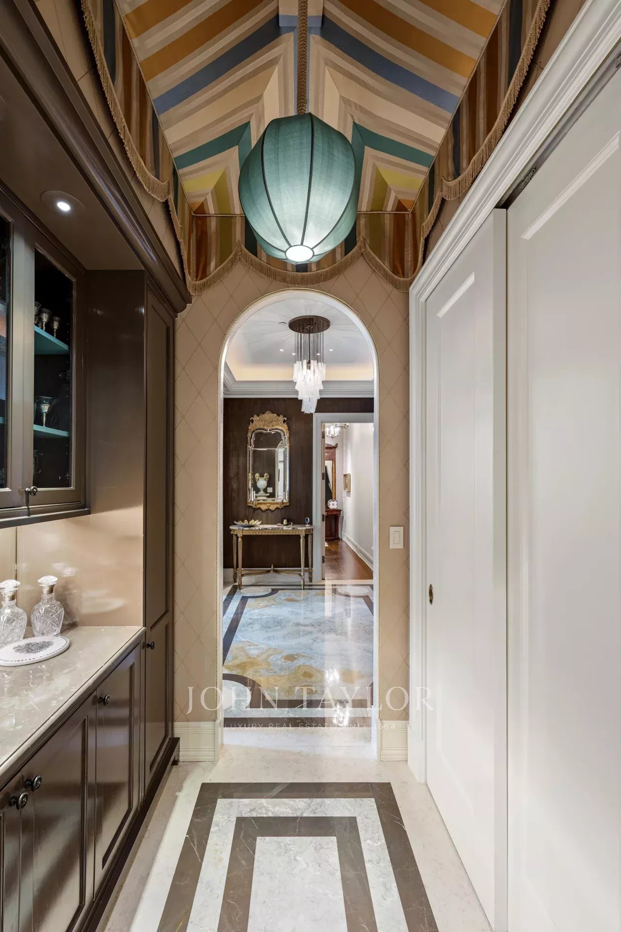Impeccable attention to detail is evident throughout the home, with noteworthy focal points that captivate the eye. A bar area, boasting a whimsical tented ceiling, becomes a charming centerpiece, while the powder room ceiling shines with a lavish gold leaf finish. The dining room walls are sumptuously upholstered, while custom plaster moldings and lattice-work ceilings add a touch of refined craftsmanship. Picture rails seamlessly integrated into the crown molding provide a gallery-like feel, and the library/second bedroom, embellished with custom-milled Mahogany and Flame Mahogany, is decorated with picture rails and hanging chains.