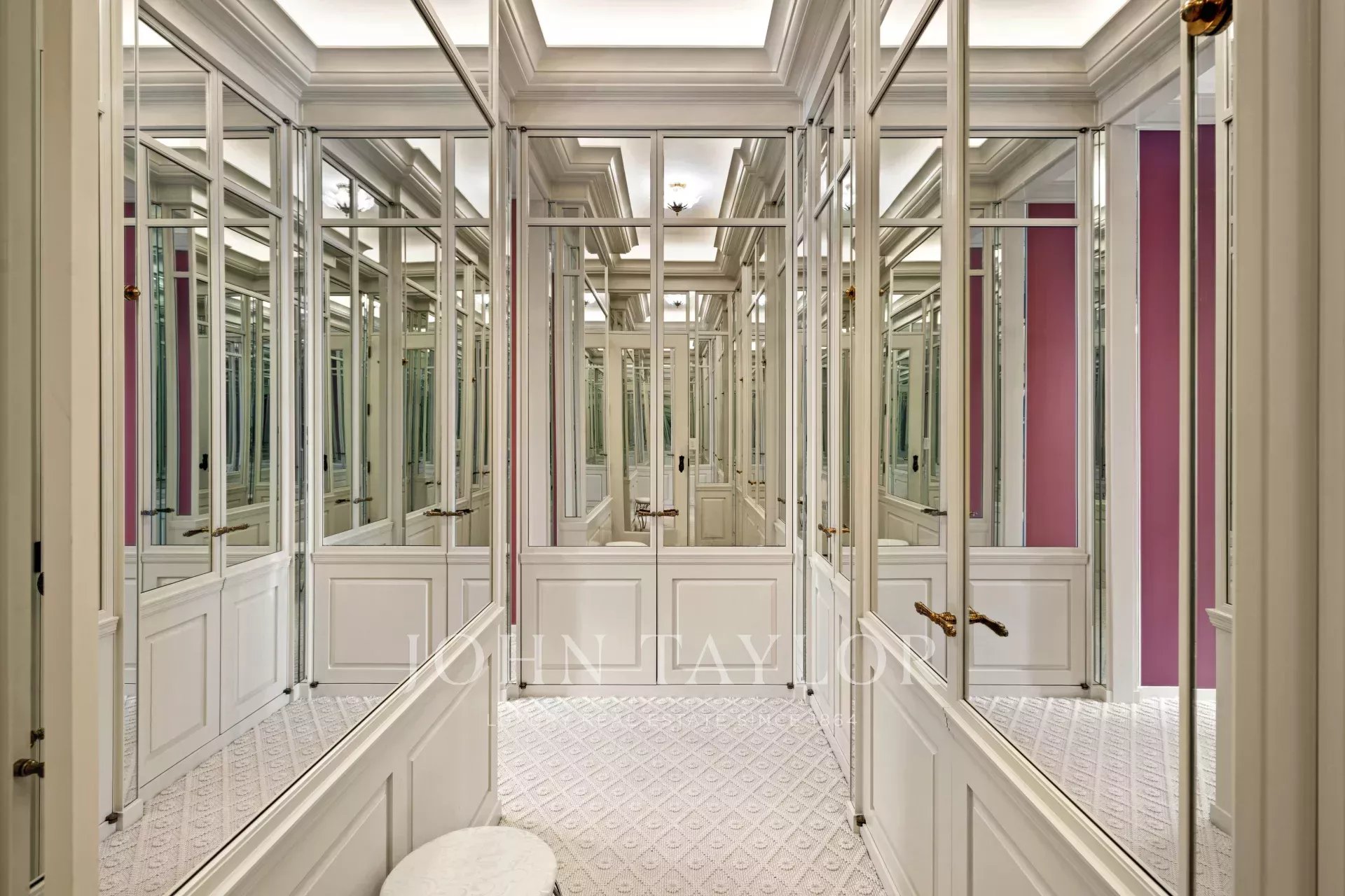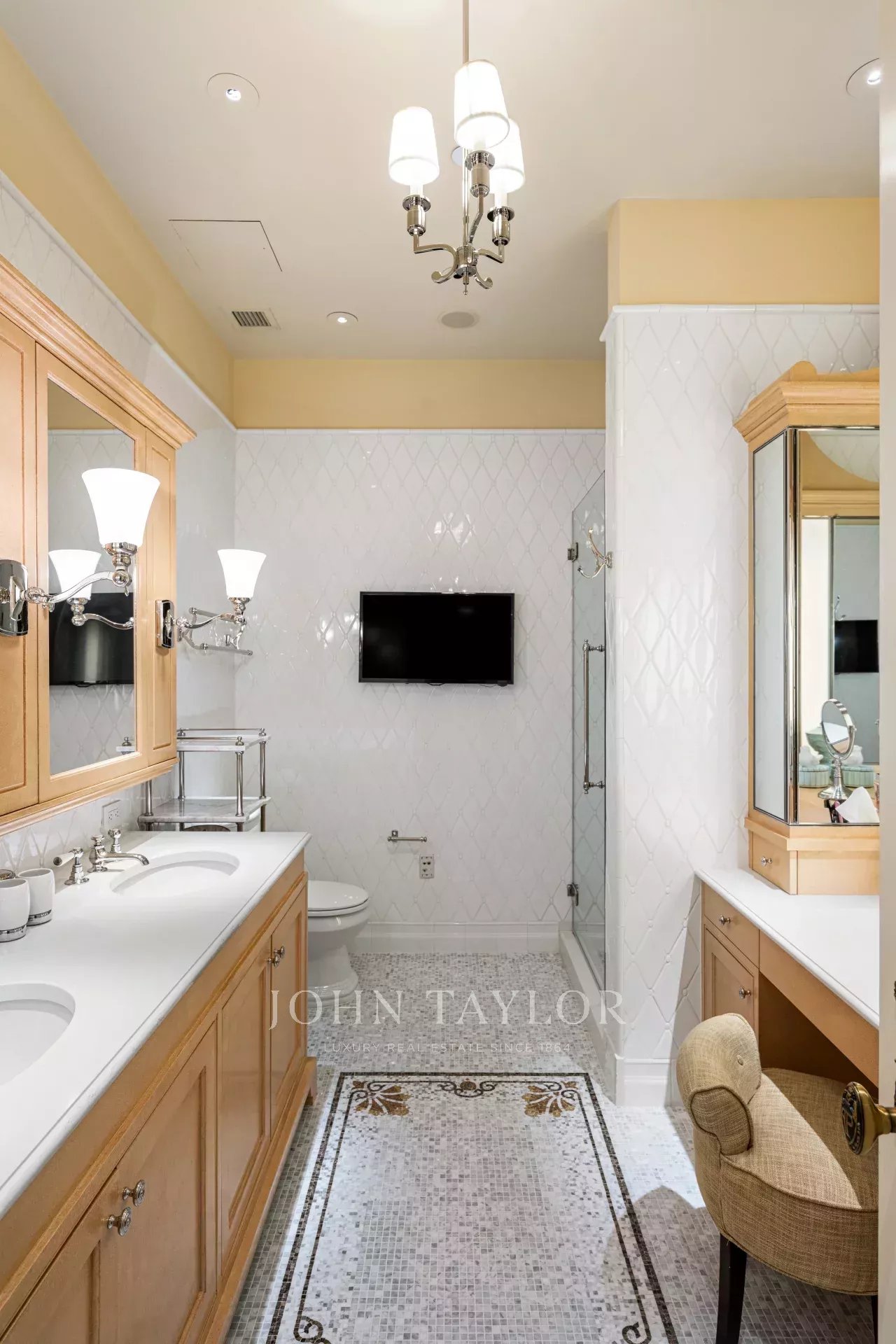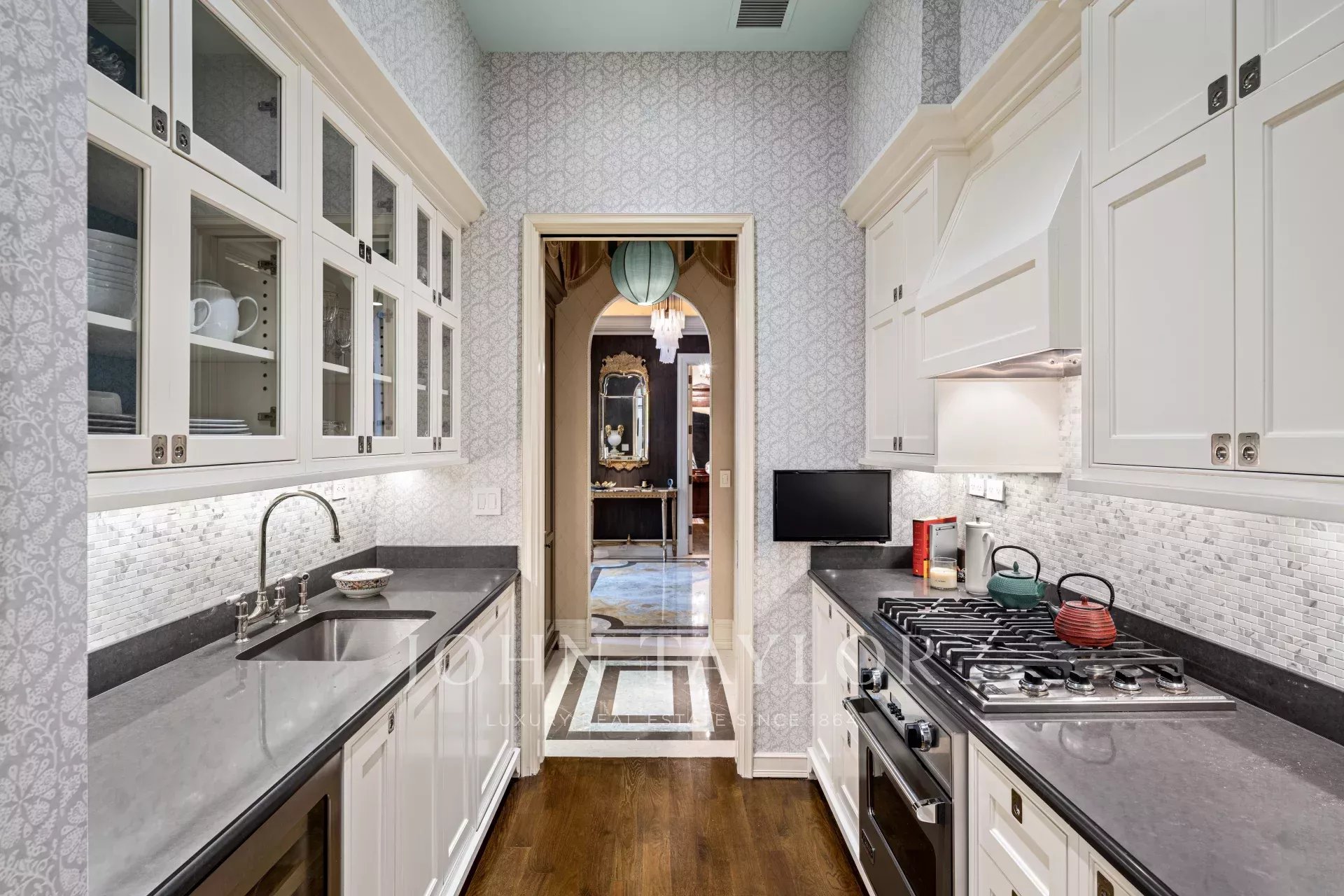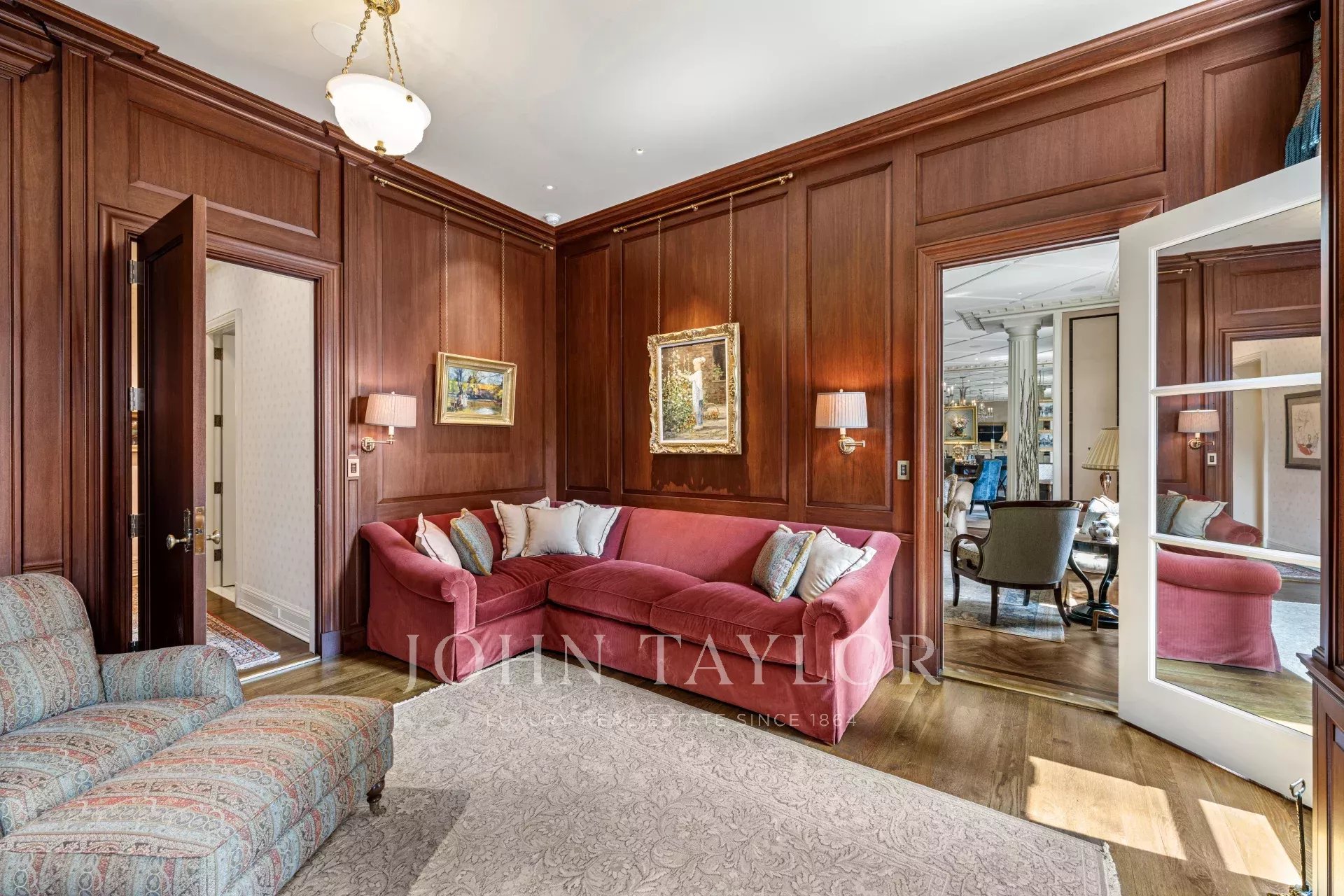 Impeccable attention to detail is evident throughout the home, with noteworthy focal points that captivate the eye. A bar area, boasting a whimsical tented ceiling, becomes a charming centerpiece, while the powder room ceiling shines with a lavish gold leaf finish. The dining room walls are sumptuously upholstered, while custom plaster moldings and lattice-work ceilings add a touch of refined craftsmanship. Picture rails seamlessly integrated into the crown molding provide a gallery-like feel, and the library/second bedroom, embellished with custom-milled Mahogany and Flame Mahogany, is decorated with picture rails and hanging chains.