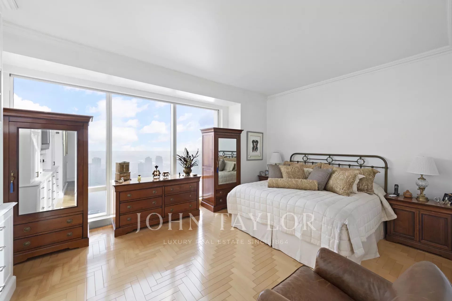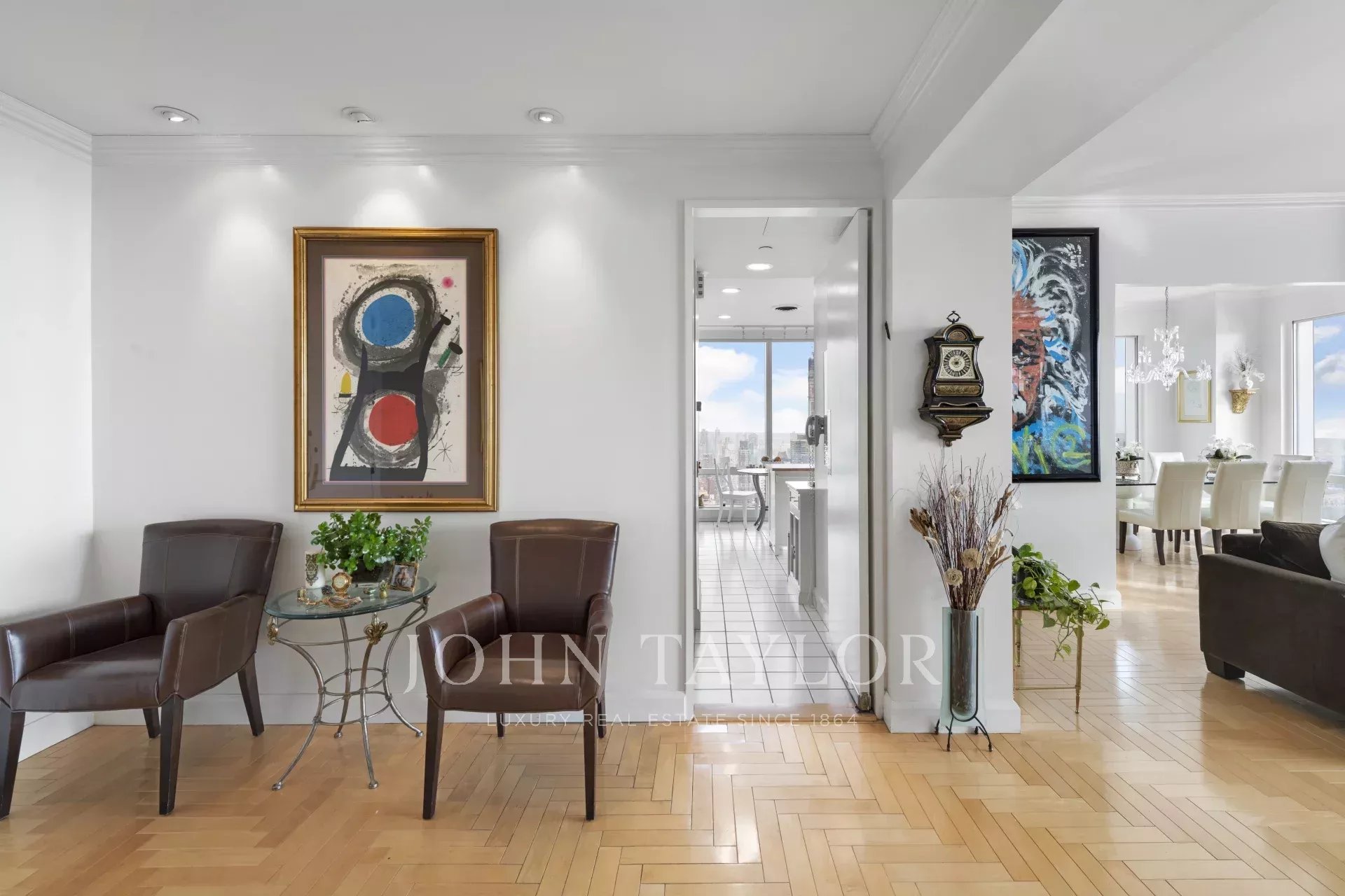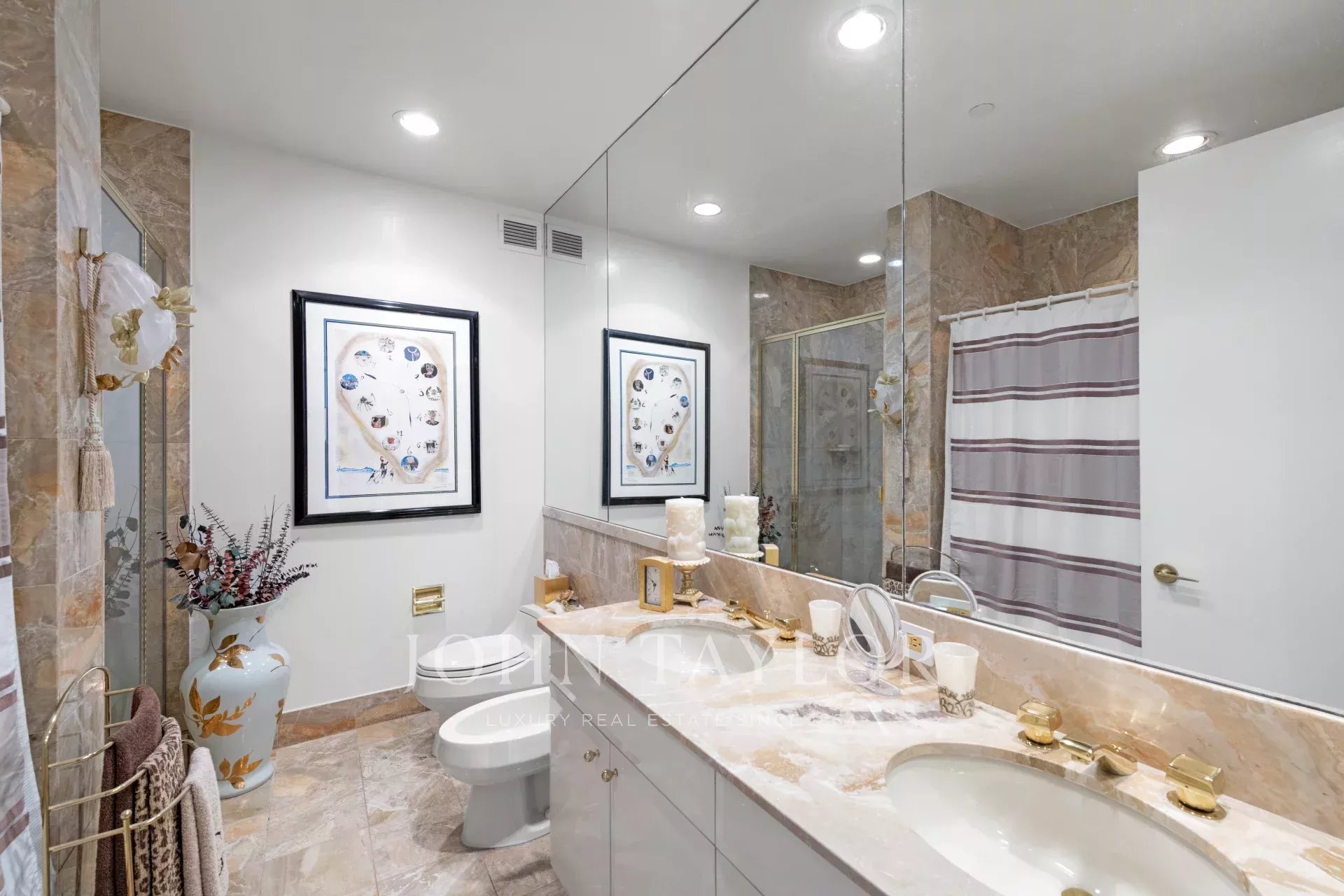 The master features a walk-in closet, an en-suite marble bathroom, and custom built-ins. The building offers 5-star service including a full-service 24-hour concierge, a private driveway with valet parking, a resident garden, spa, health club, indoor pool, and a four-star restaurant and bar.