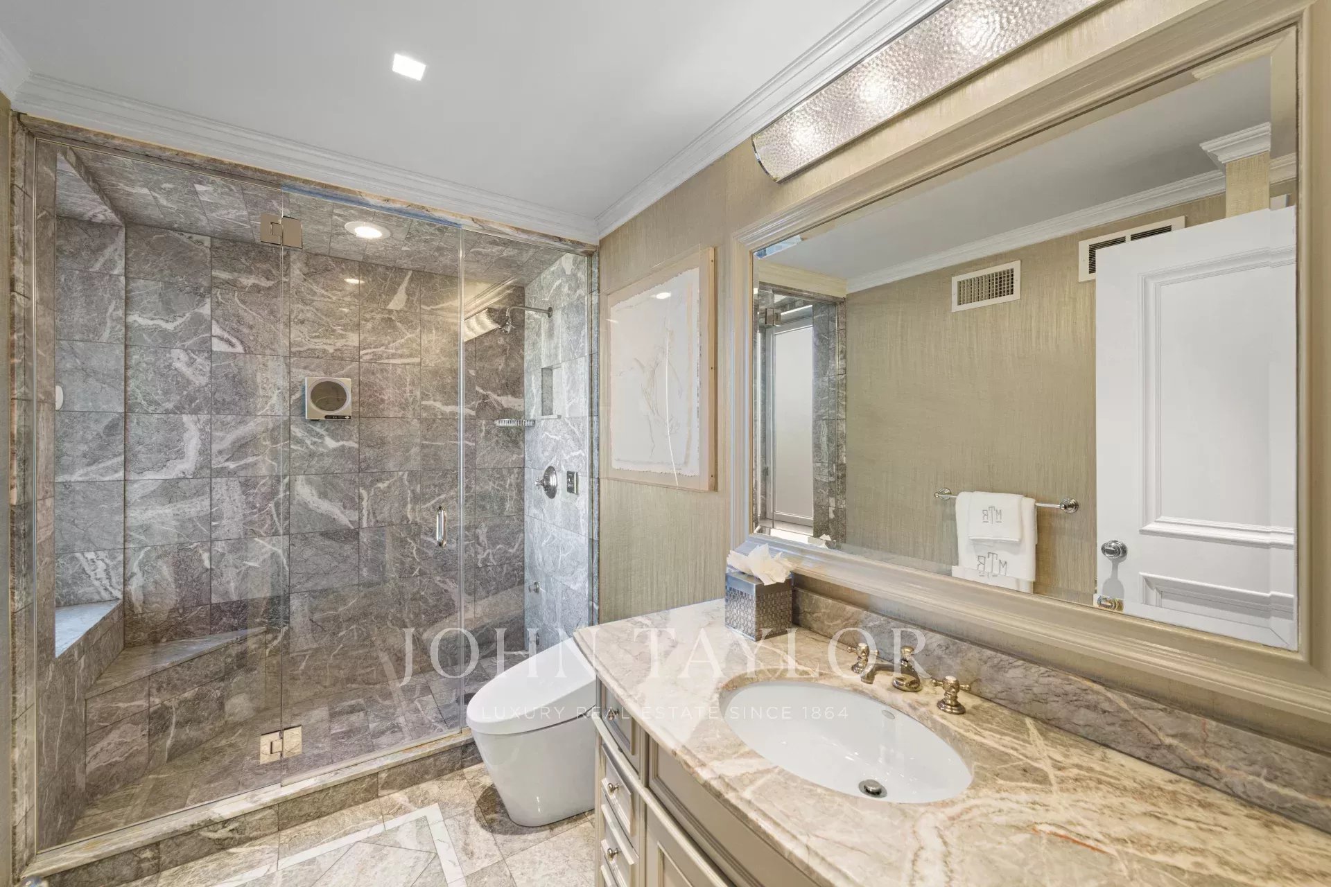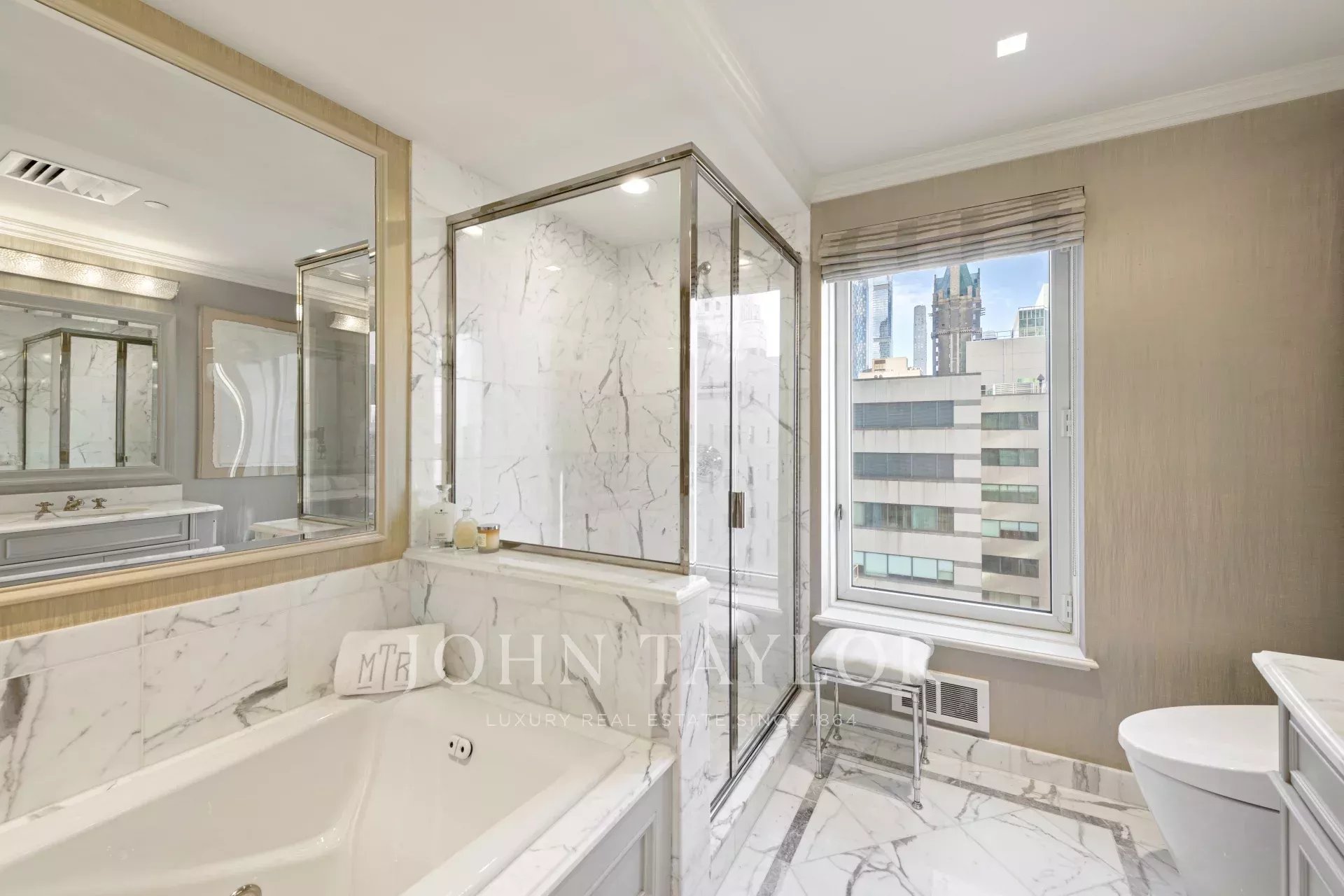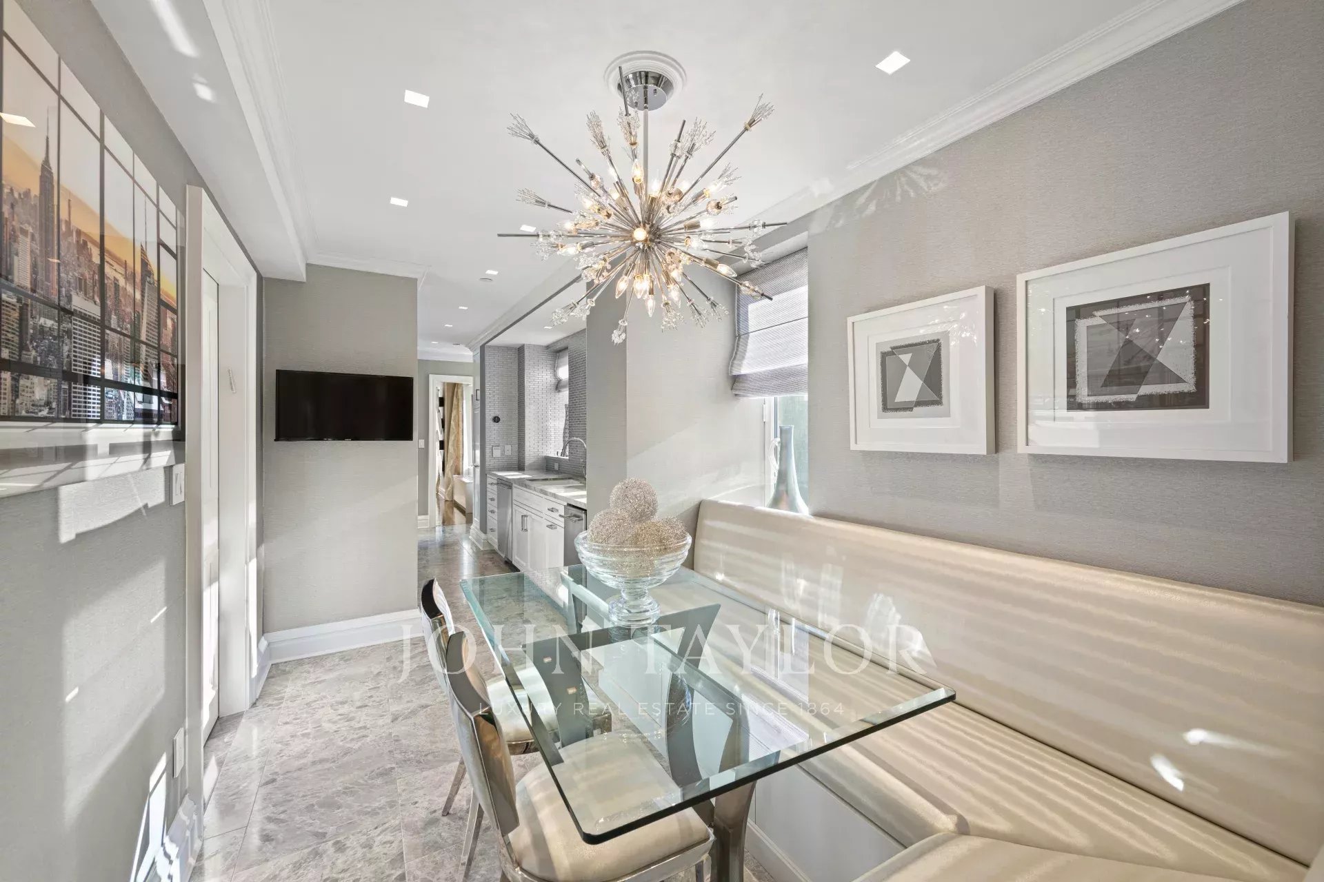 The oversized living room with three exposures, a beautiful bar, and fireplace can be arranged for large or intimate gatherings to fit your needs. The sleek sun-filled gourmet kitchen is impeccably appointed for the chef with top-of-the-line stainless steel appliances, custom cabinetry, marble countertops and flooring, glass tile backsplash, and under-mount cast iron sink. Off of the kitchen is a cozy breakfast area perfect for morning coffee in the custom banquette seating.