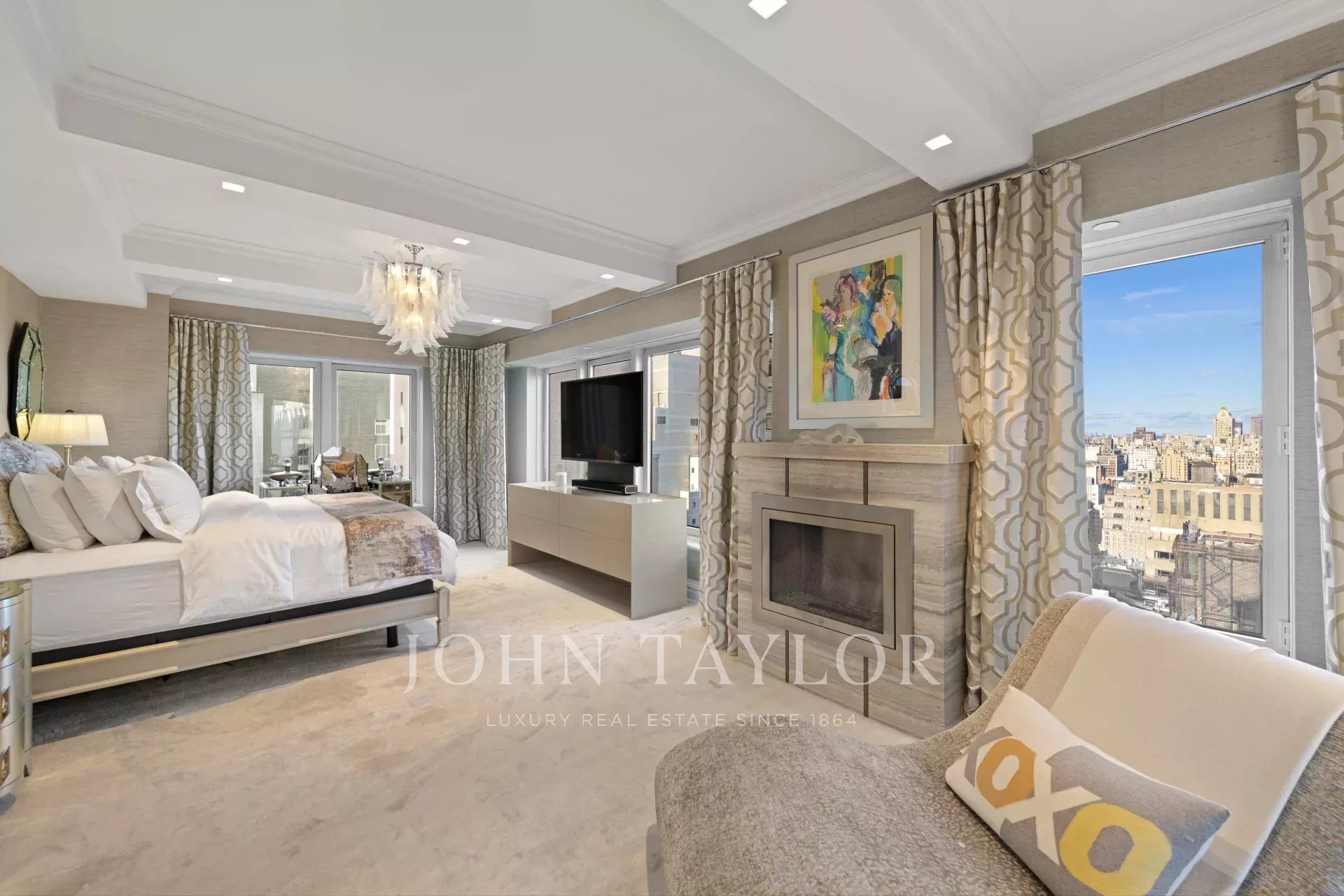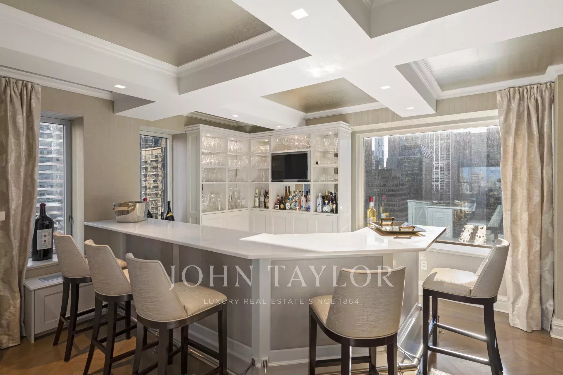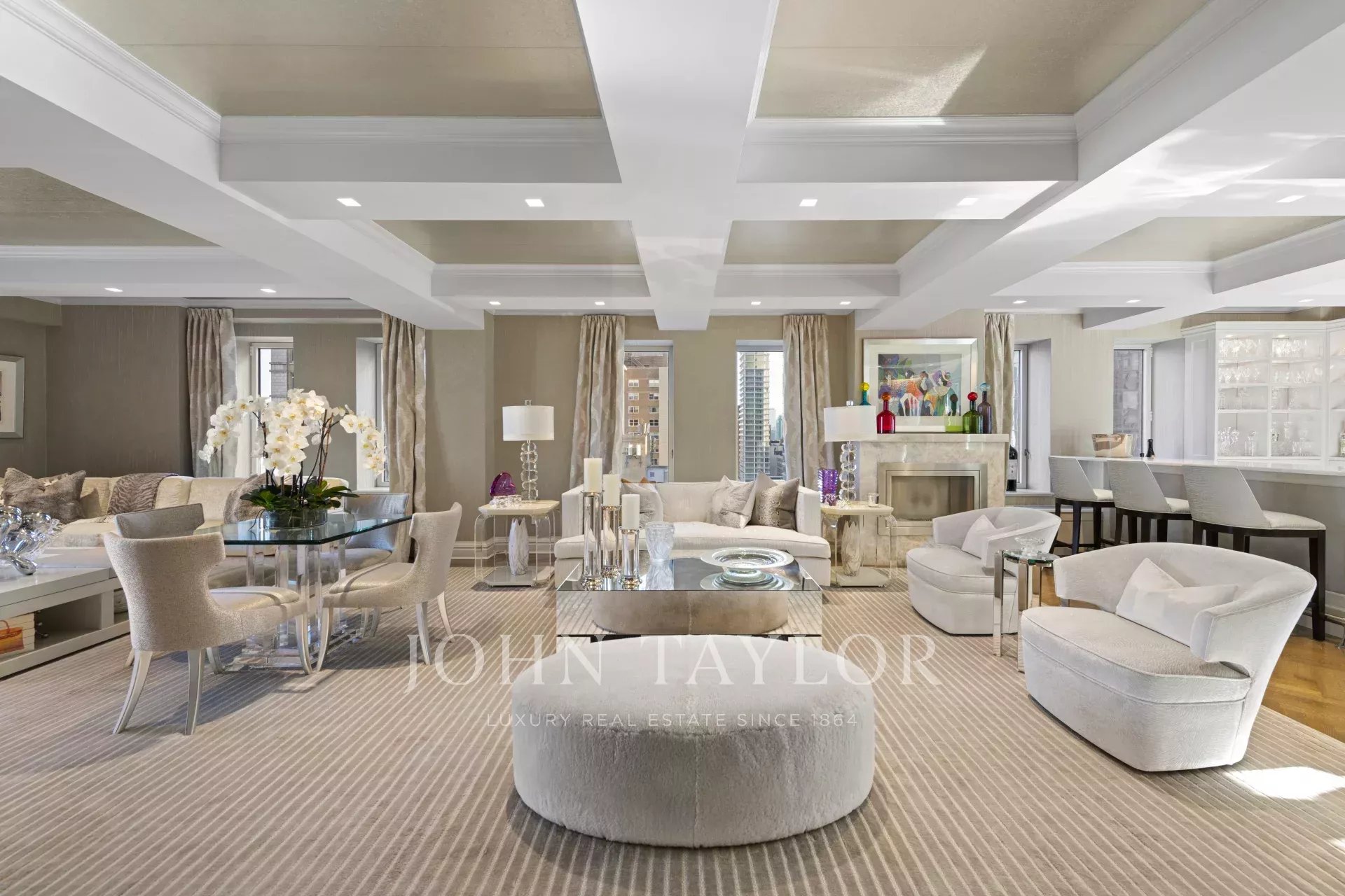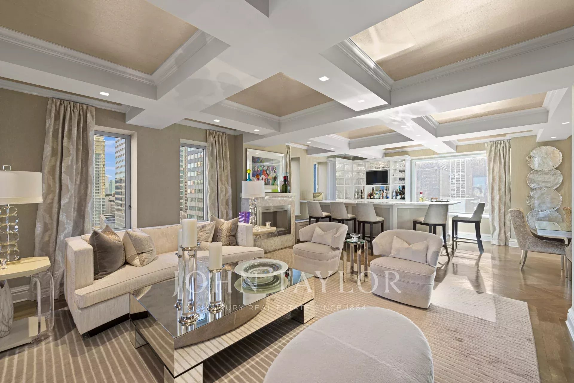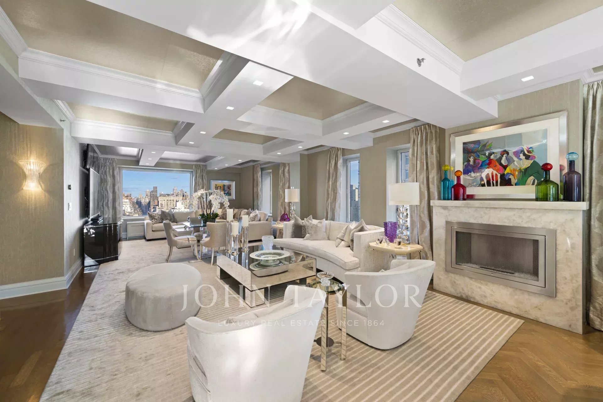 Step off of your private elevator into this Penthouse in the sky. Penthouse 27 is a magnificent luxury residence designed by Patricia Bonis Interiors with immaculate views located in one of Manhattan's most exclusive pre-war condominiums right off Park Avenue. Featuring 4-Bedrooms, 5.5-Baths, three fireplaces and spanning over 4,205 square feet with windows wrapping the entire residence, allowing natural light to flood in and gorgeous views. The grand interiors provide a seamless flow for upscale living and entertaining. Every detail is of the highest quality, with top-of-the-line finishes throughout such as solid oak wood herringbone floors, striking coffered ceilings, custom moldings, handcrafted Italian brass doorknobs, Fior de Pesco marble baths with bowed white wood cabinetry and Watermark chrome-nickel fixtures, and other refined elements.