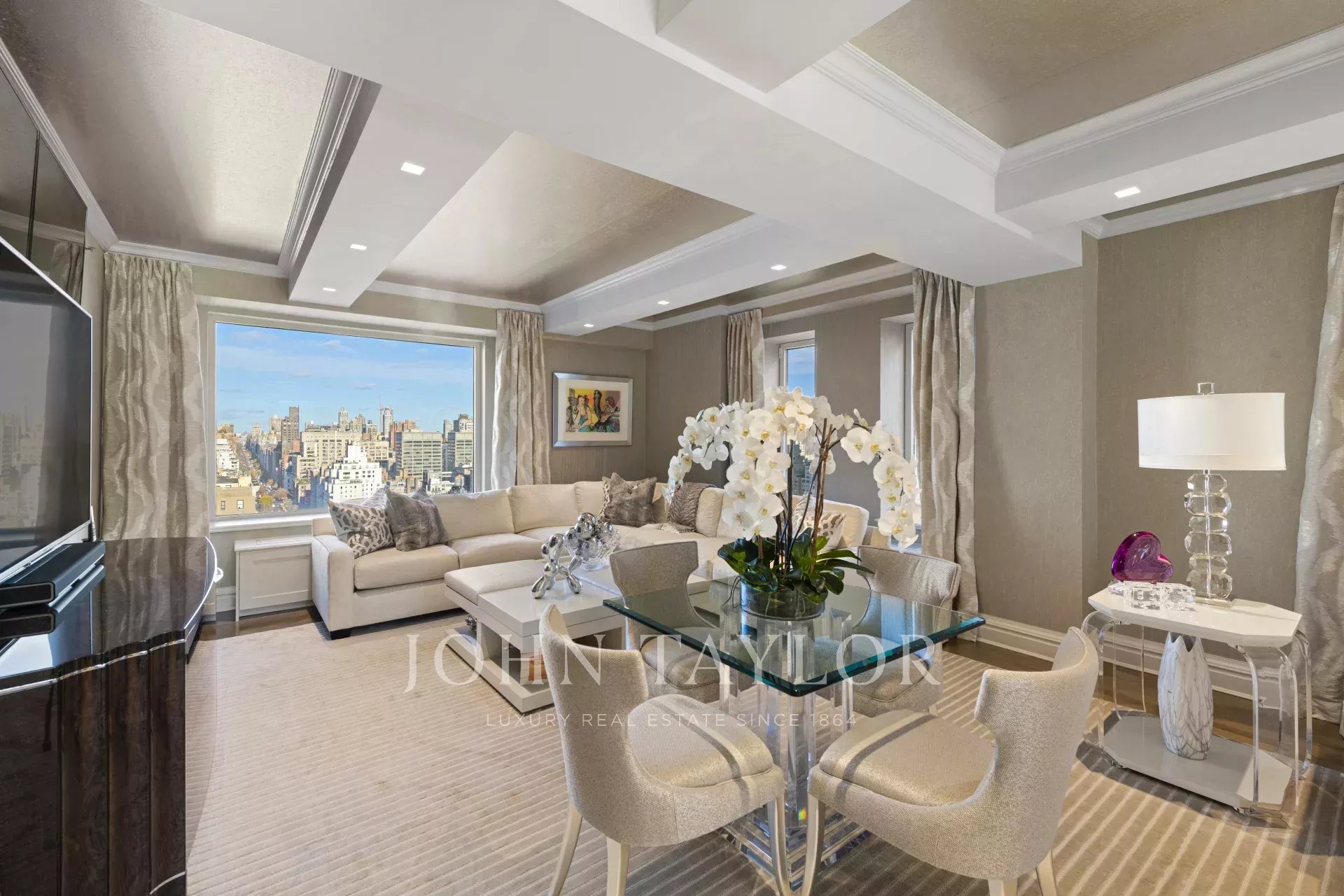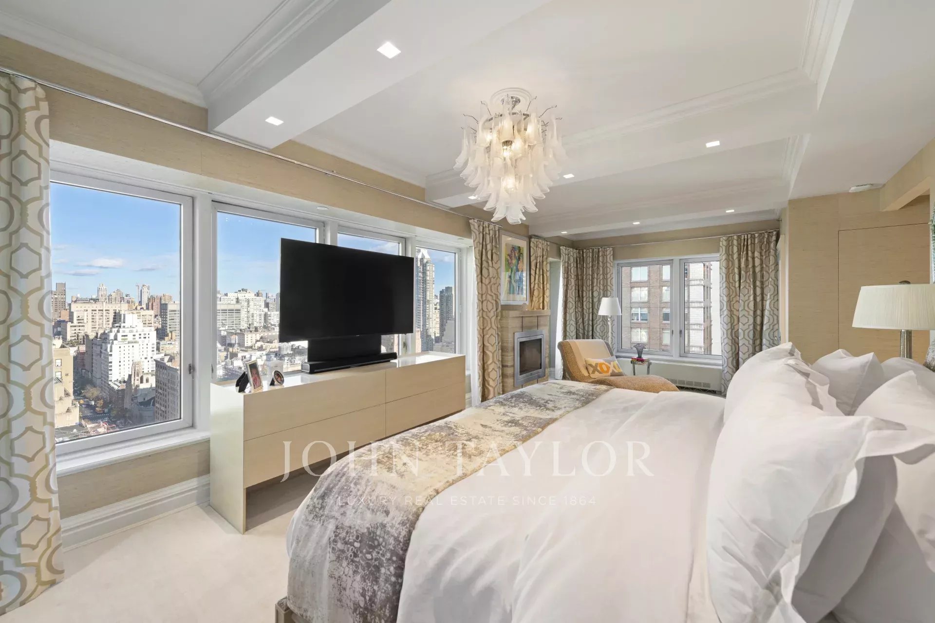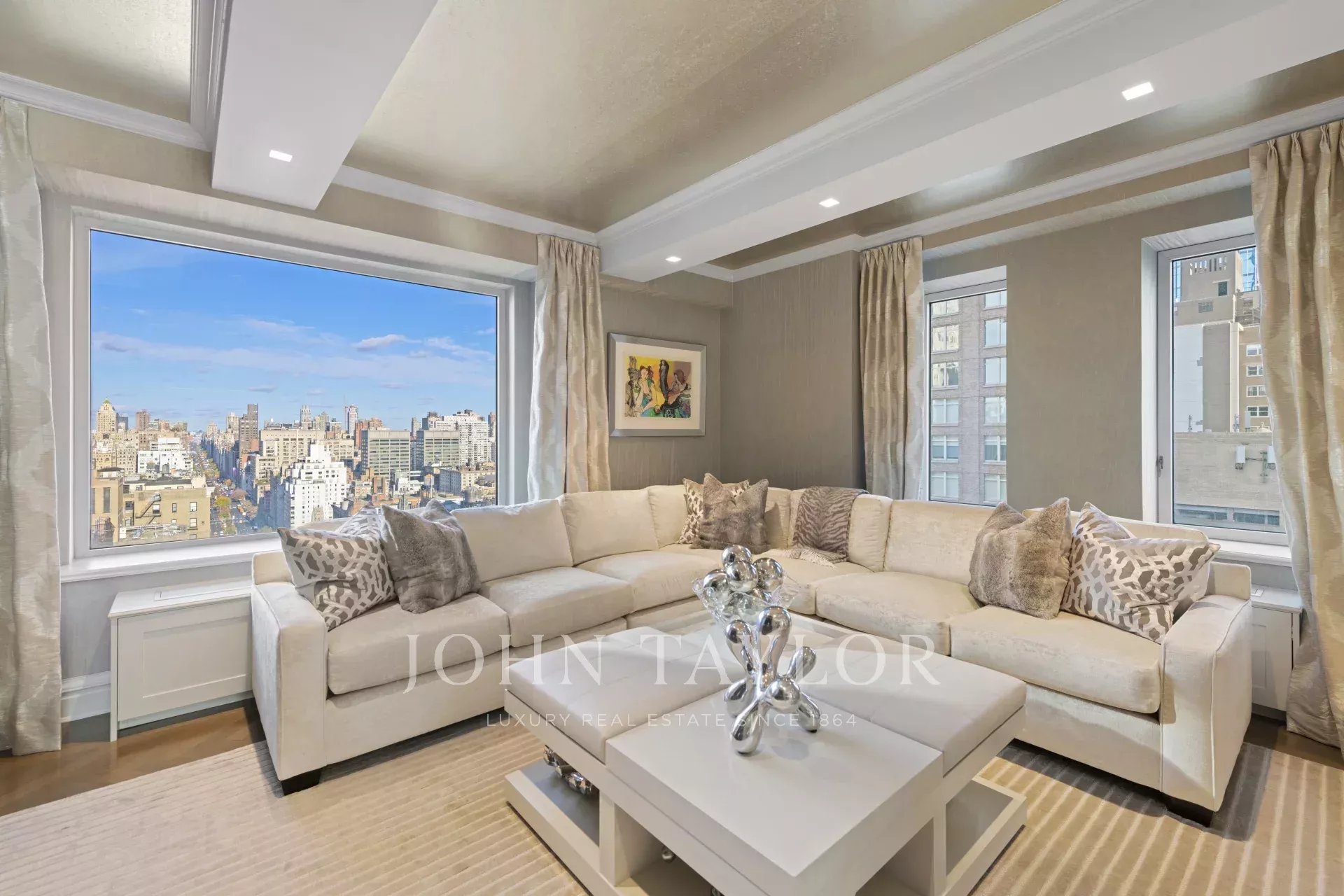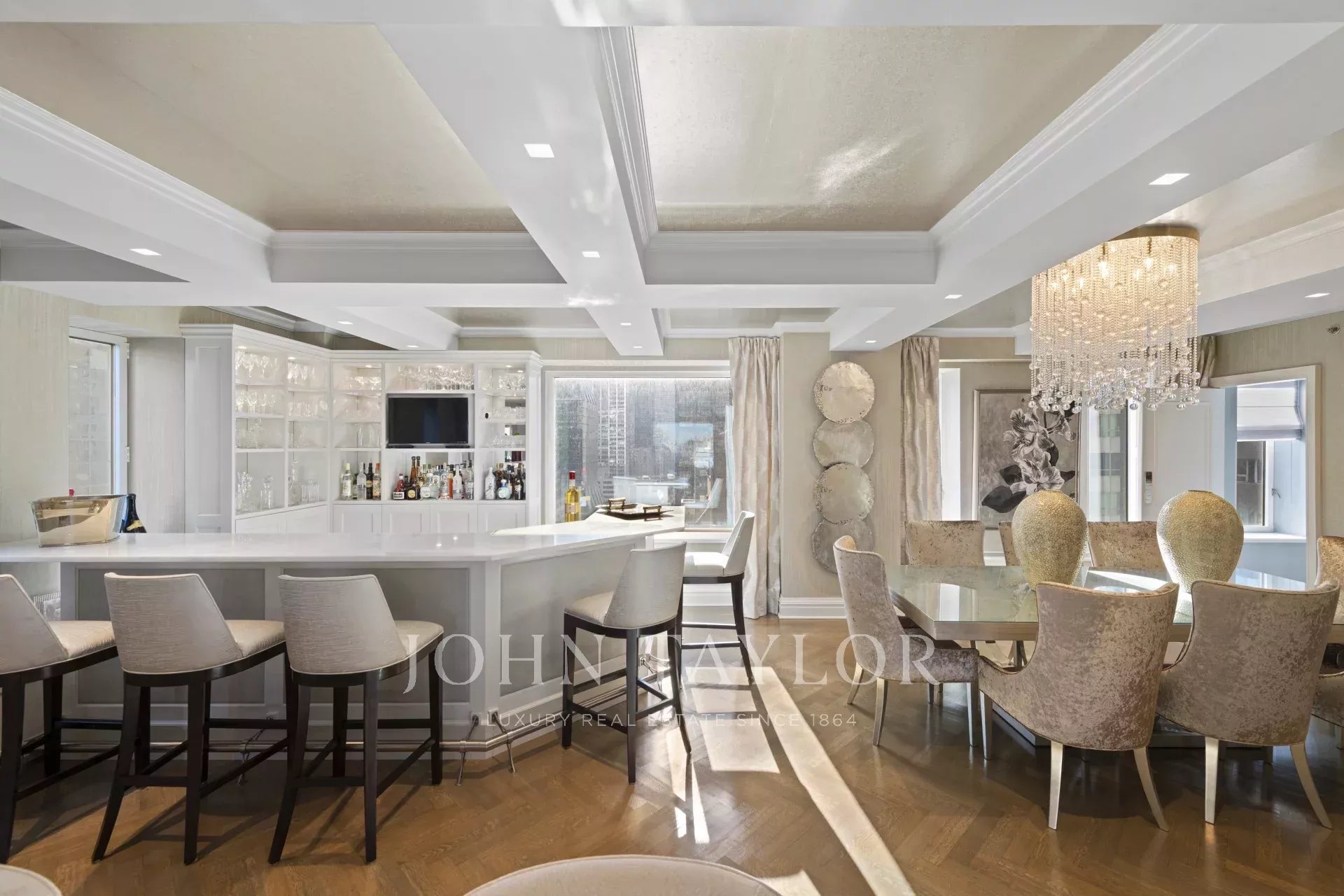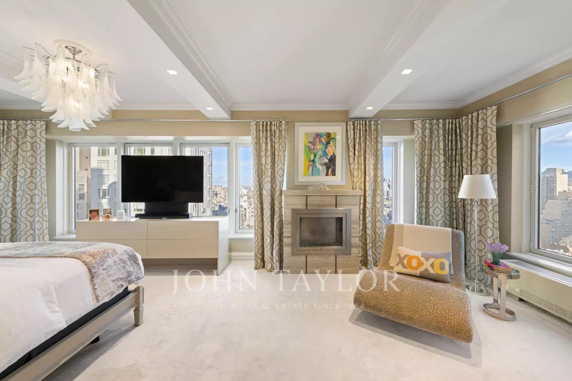 Step off of your private elevator into this Penthouse in the sky. Penthouse 27 is a magnificent luxury residence designed by Patricia Bonis Interiors with immaculate views located in one of Manhattan's most exclusive pre-war condominiums right off Park Avenue. Featuring 4-Bedrooms, 5.5-Baths, three fireplaces and spanning over 4,205 square feet with windows wrapping the entire residence, allowing natural light to flood in and gorgeous views. The grand interiors provide a seamless flow for upscale living and entertaining. Every detail is of the highest quality, with top-of-the-line finishes throughout such as solid oak wood herringbone floors, striking coffered ceilings, custom moldings, handcrafted Italian brass doorknobs, Fior de Pesco marble baths with bowed white wood cabinetry and Watermark chrome-nickel fixtures, and other refined elements.