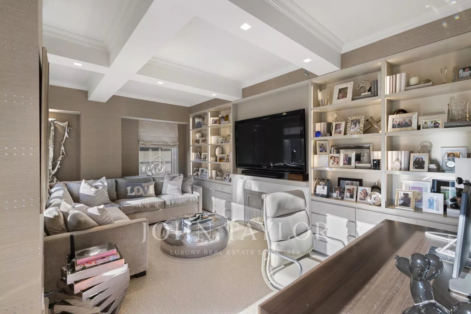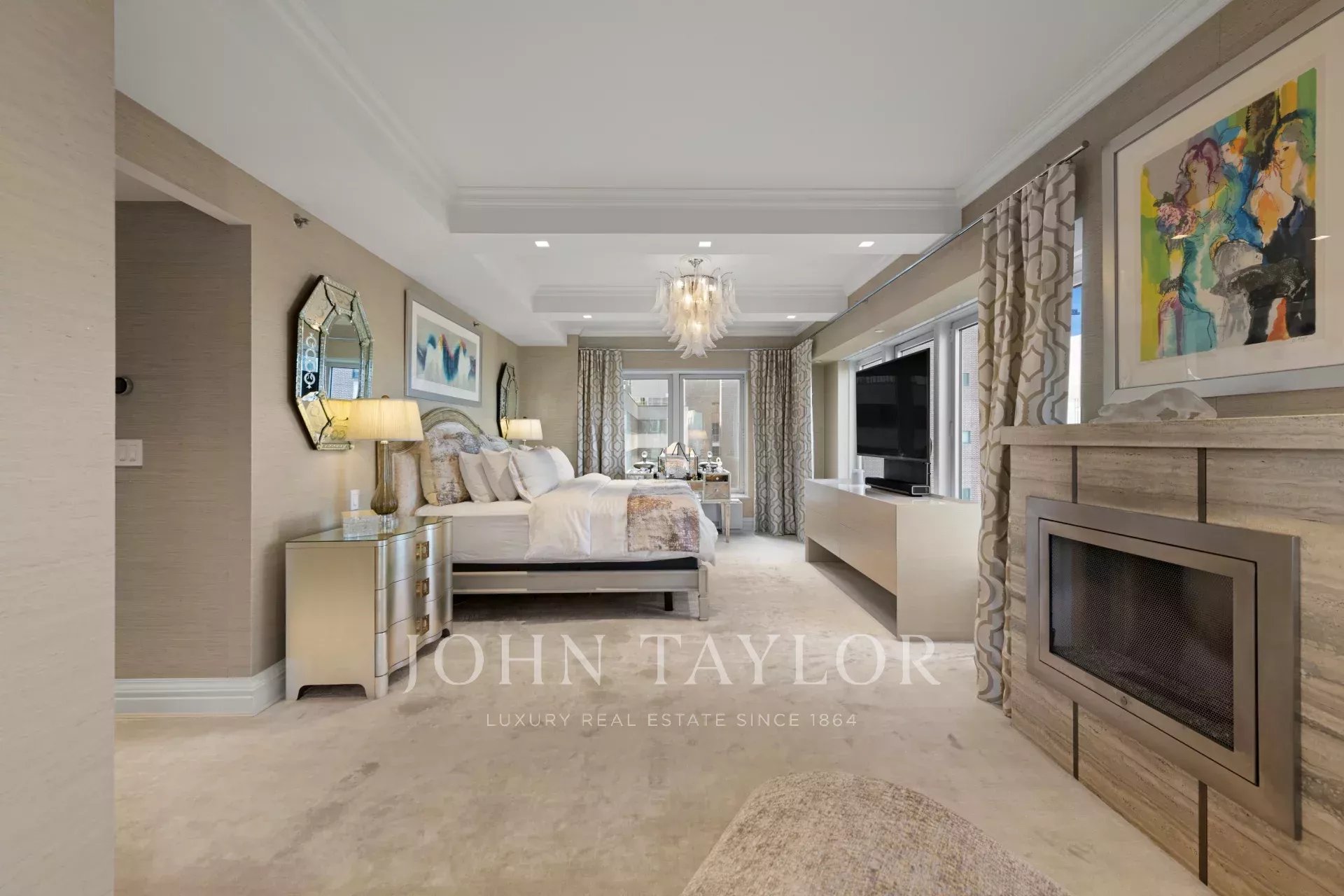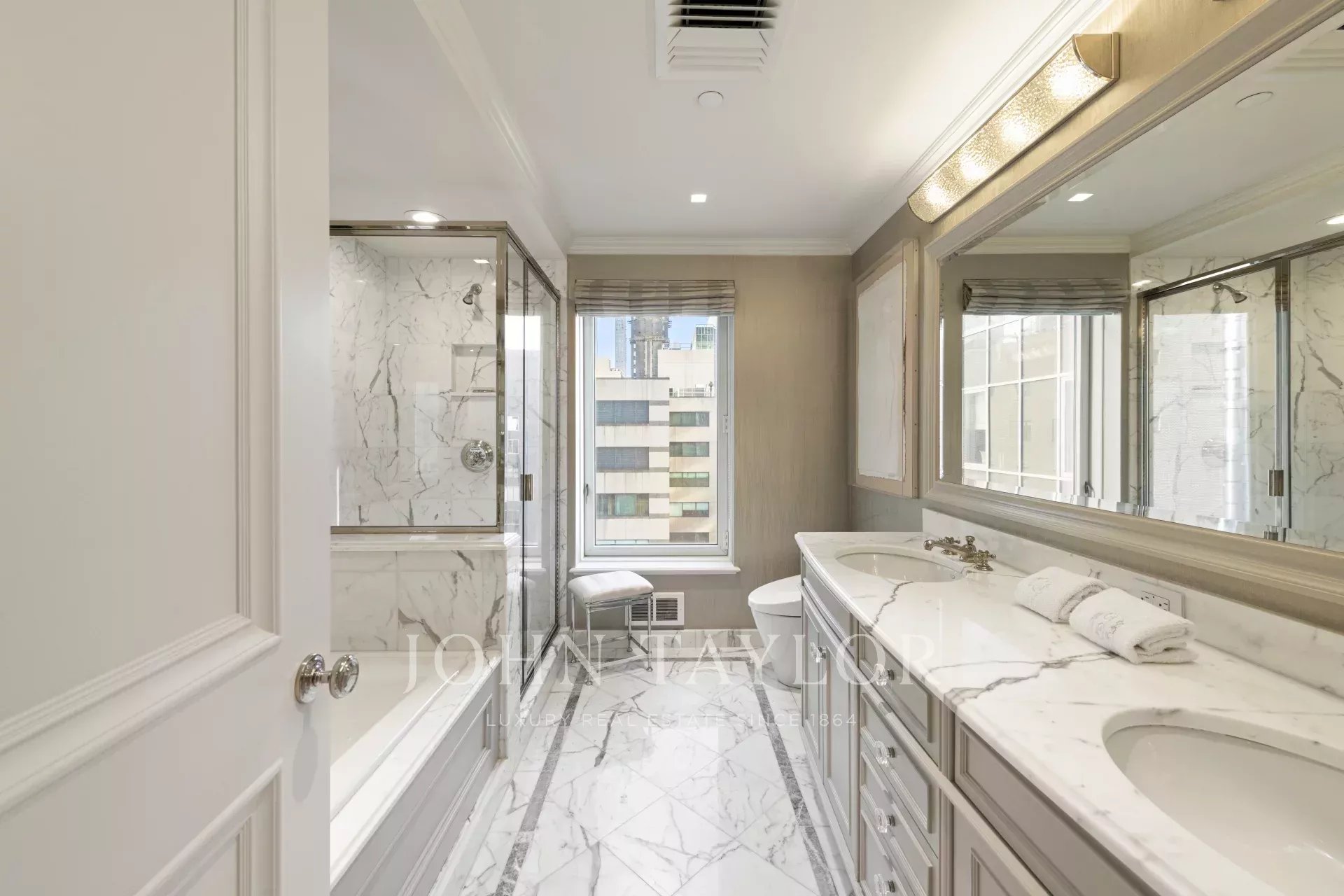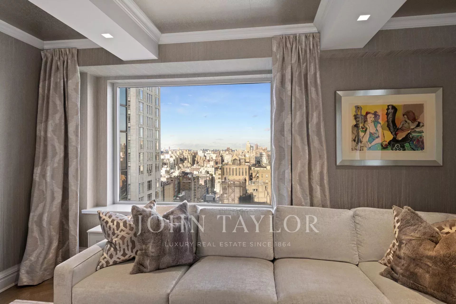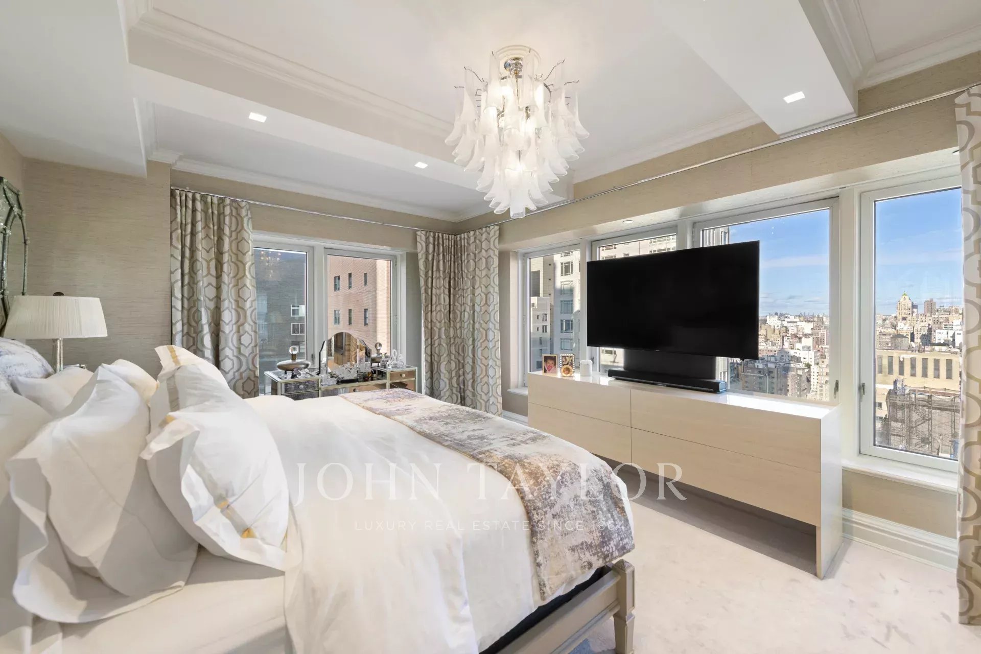 Step off of your private elevator into this Penthouse in the sky. Penthouse 27 is a magnificent luxury residence designed by Patricia Bonis Interiors with immaculate views located in one of Manhattan's most exclusive pre-war condominiums right off Park Avenue. Featuring 4-Bedrooms, 5.5-Baths, three fireplaces and spanning over 4,205 square feet with windows wrapping the entire residence, allowing natural light to flood in and gorgeous views. The grand interiors provide a seamless flow for upscale living and entertaining. Every detail is of the highest quality, with top-of-the-line finishes throughout such as solid oak wood herringbone floors, striking coffered ceilings, custom moldings, handcrafted Italian brass doorknobs, Fior de Pesco marble baths with bowed white wood cabinetry and Watermark chrome-nickel fixtures, and other refined elements.
