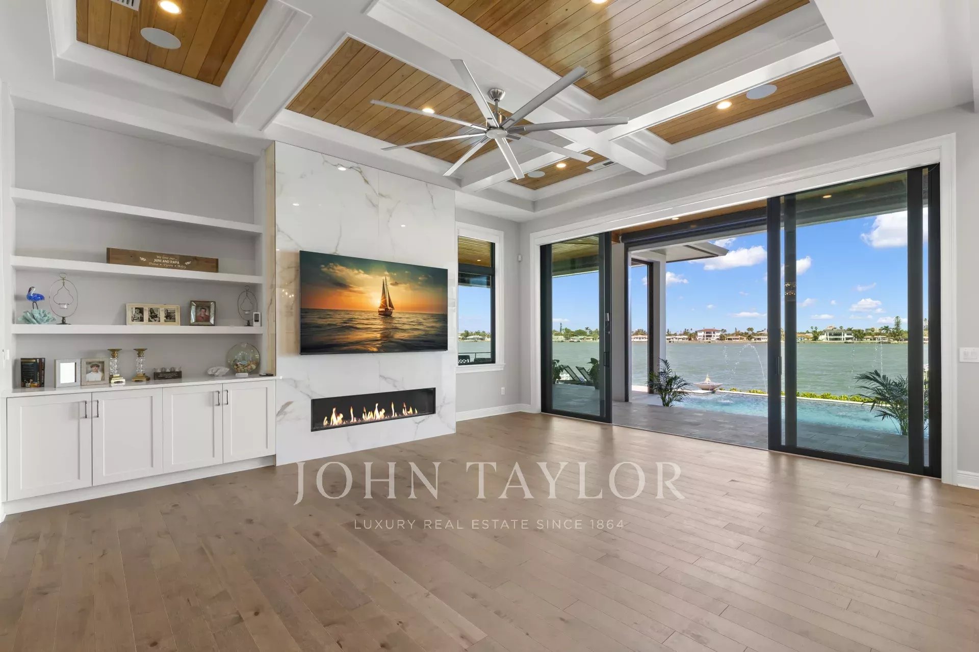 Presenting a stunning waterfront masterpiece in Tierra Verde, Florida, custom built in 2022 by Alvarez Homes. This exceptional property is a true coastal gem, designed to maximize open water views and offer a luxurious yet inviting lifestyle tailored to modern needs. From the moment you arrive, the coastal contemporary design and meticulous attention to detail including Zosia grass lawn, will capture your imagination. Step inside to discover an open floor plan with high 12 ft volume ceilings and exquisite coffered ceiling details, complete with tongue and groove wood inlet. Every corner of this home exudes quality, featuring wide plank hardwood flooring and level 5 flat texture walls and ceilings. The main living level hosts a spacious primary suite, complete with a sizable walk-in closet featuring a custom closet system and a luxurious primary bath showcasing spectacular large dimension marble slabs, a walk-in frameless glass shower, separate soaking tub, separate vanities, and a private water closet.